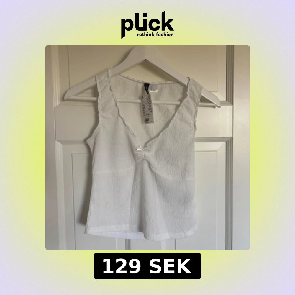Superfin vit linnetopp från H&M Divided med v-ringning och liten söt rosett framtill. Toppen är ärmlös och har en lätt strukturerad, krinklad yta som ger en cool känsla. Perfekt att styla med jeans eller kjol för en fräsch look.