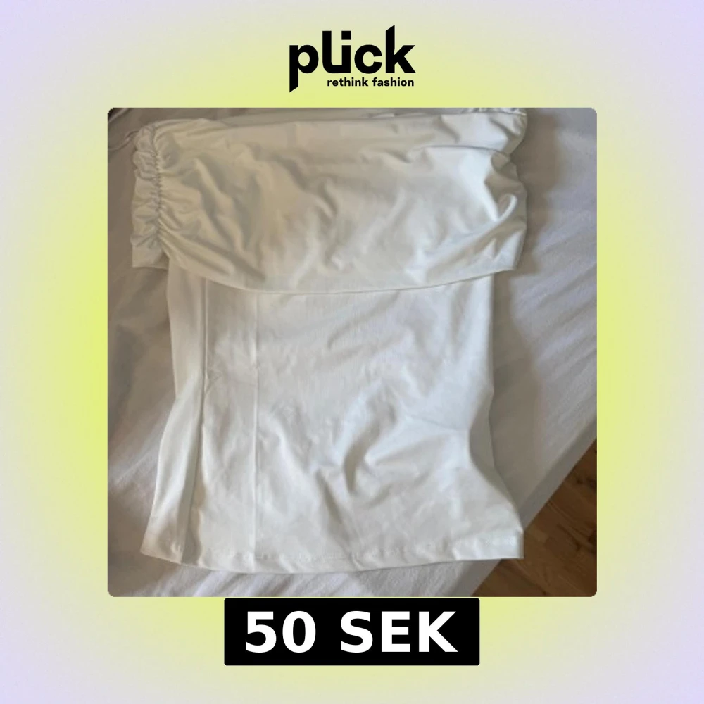 Supersnygg vit offshoulder topp från H&M Divided i stretchigt material. Toppen har en bandeau-liknande överdel med rynkade detaljer på sidorna och sitter tight över kroppen. Perfekt för dig som vill ha en stilren och trendig look. Helt nyskick aldrig använd.