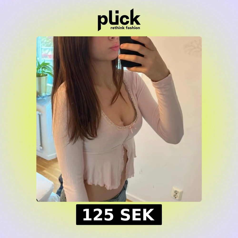 Supersöt ljusrosa croppad blus med långa ärmar och v-ringad hals. Blusen har spetskant runt halsen och en liten rosett framtill. Volang nedtill ger en extra feminin touch. Perfekt för dig som gillar romantisk och trendig stil.