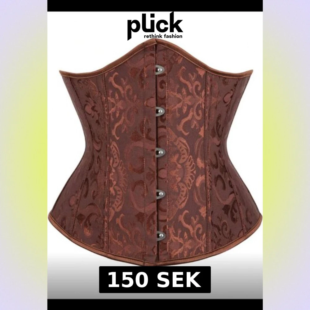 Säljer en snygg kaffeebrun korsett med brokadmönster och metallknappar framtill. Baksidan har bred snörning med satinband för perfekt passform. Korsetten har en markerad midja och klassisk form som ger en cool siluett.