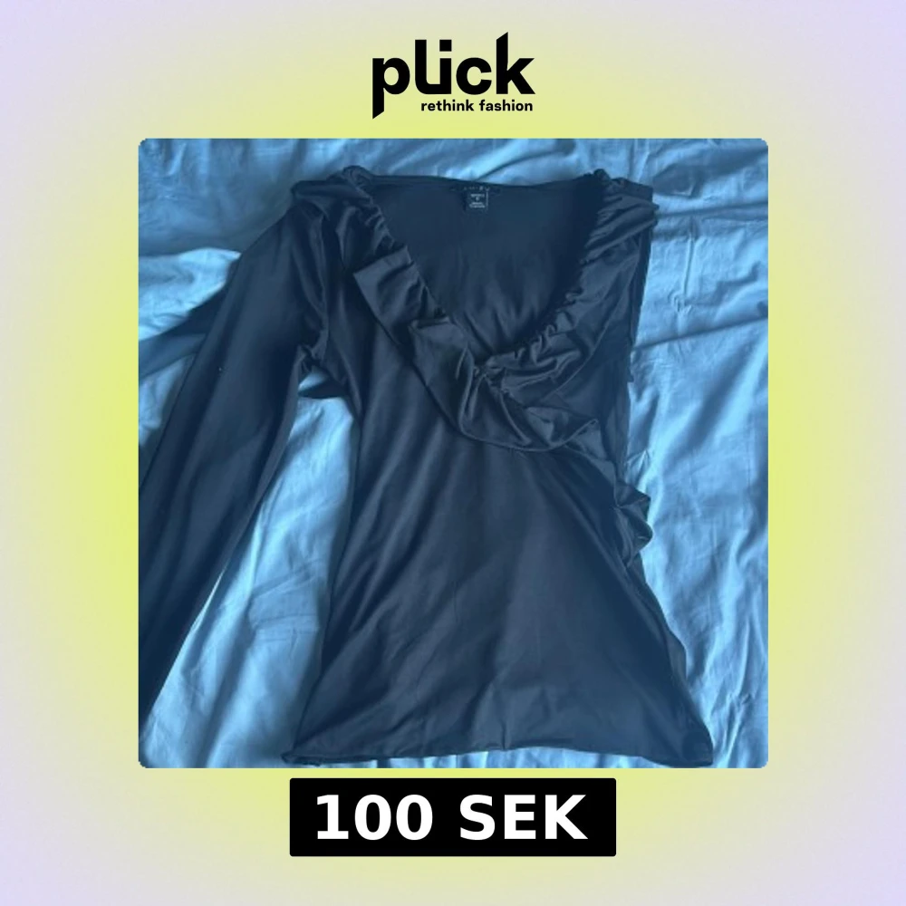 Svart blus från Amisu i storlek S med lång ärm och djup v-ringning. Snygga volangdetaljer längs halsringningen och framtill ger en cool och trendig look. Mjukt och stretchigt material som sitter bekvämt och följer kroppen.