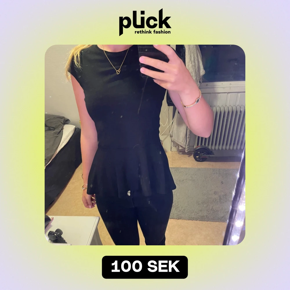 Snygg svart topp med volangdetalj i nederkant. Den är ärmlös och har en tight passform som framhäver figuren. Perfekt för både vardag och festliga tillfällen. Matcha med jeans eller kjol för en komplett look!