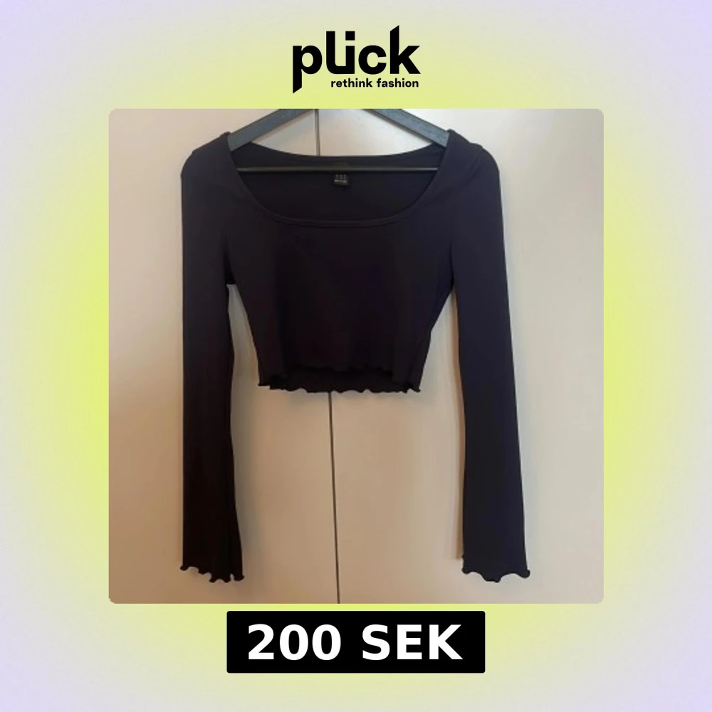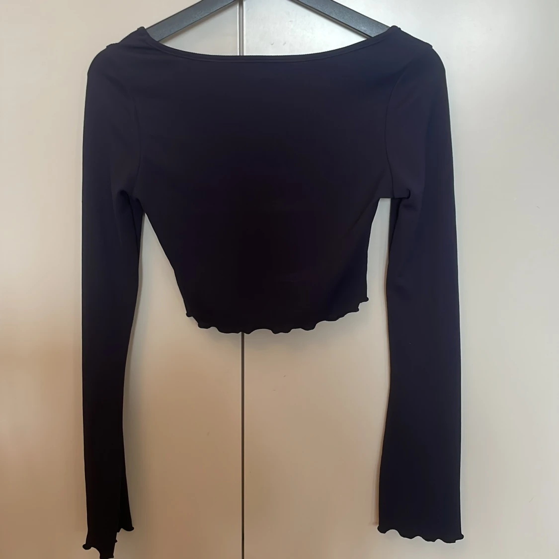 Marinblå croppad topp från Shein med långa ärmar och vågig kant nertill och vid ärmslut. Toppens material är stretchigt och har en enkel, stilren design med rundad halsringning. Perfekt för att styla med höga jeans eller kjol.