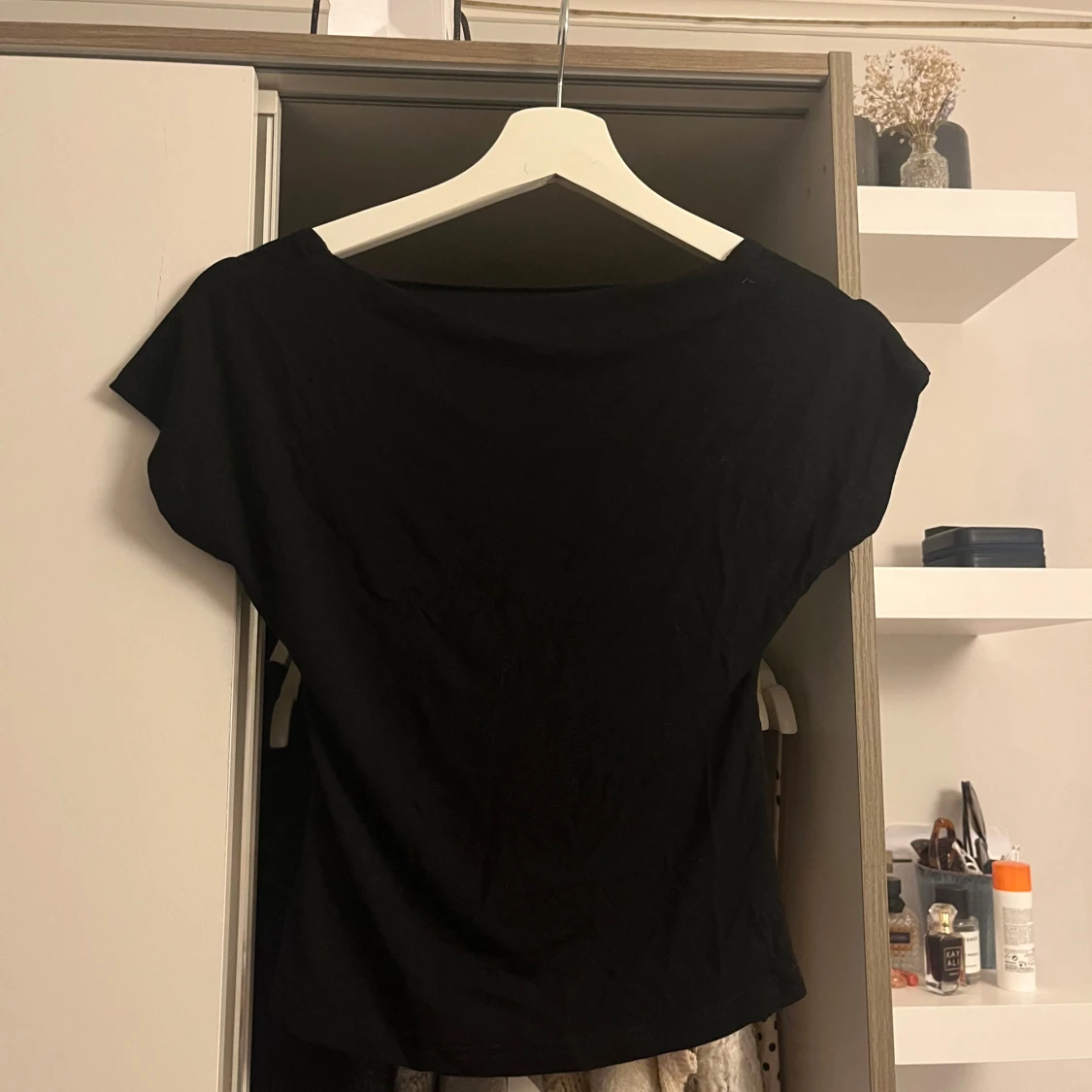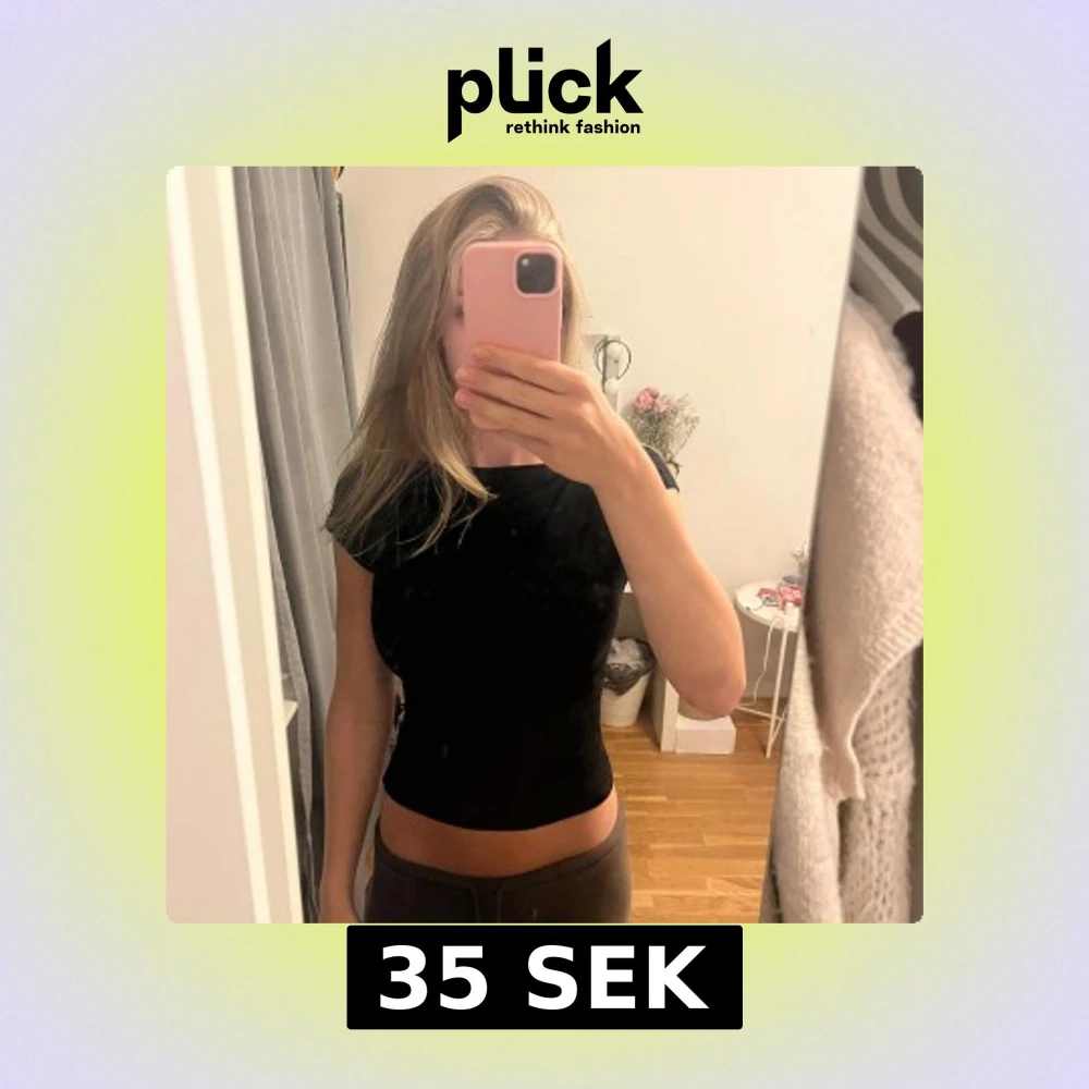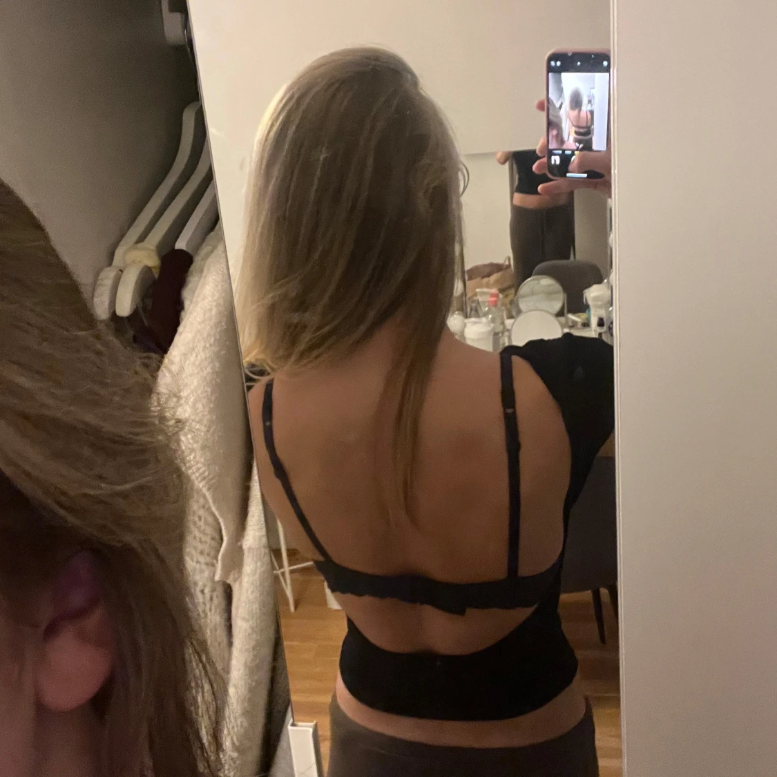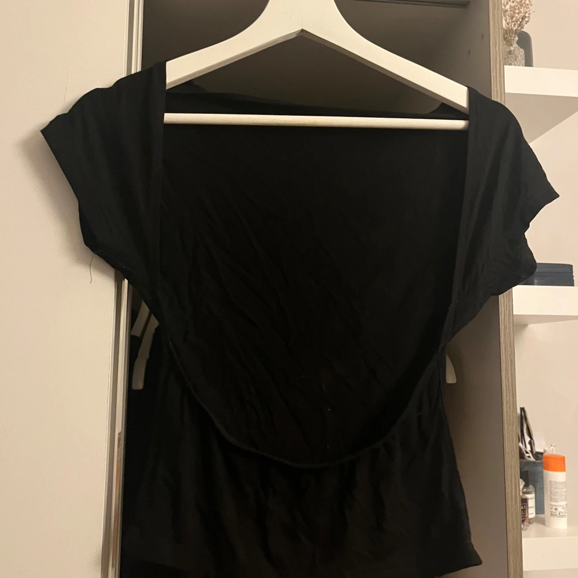 Säljer en svart croppad topp med korta ärmar och en snygg öppen rygg. Toppen har en tight passform och är tillverkad i mjuk bomull, perfekt för dig som gillar minimalistisk stil med en twist. Enkel att matcha med både jeans och kjol.