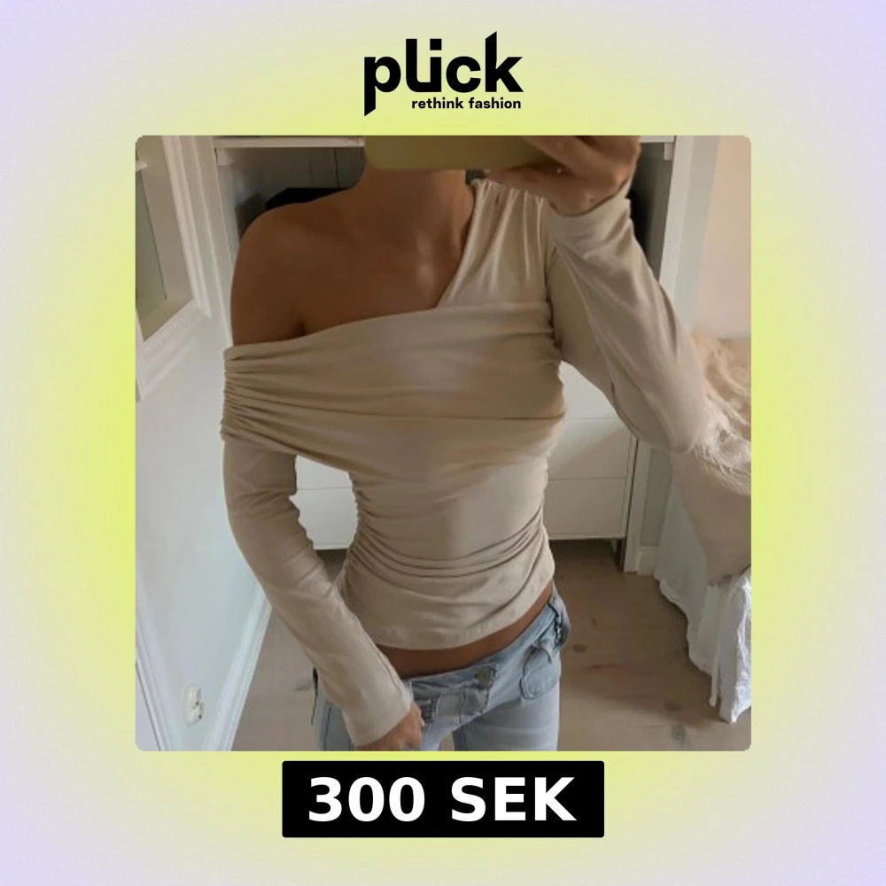 Trendig beige one shoulder topp med långa ärmar och snygg drapering över bröstet och midjan. Tunn och stretchig, perfekt för dig som vill ha en unik och stilren look. Sitter tight och framhäver figuren på ett snyggt sätt.