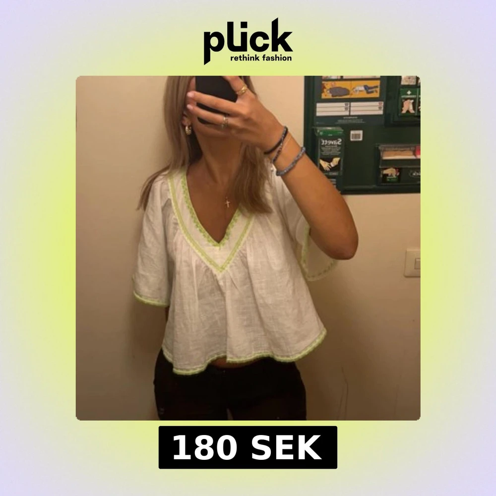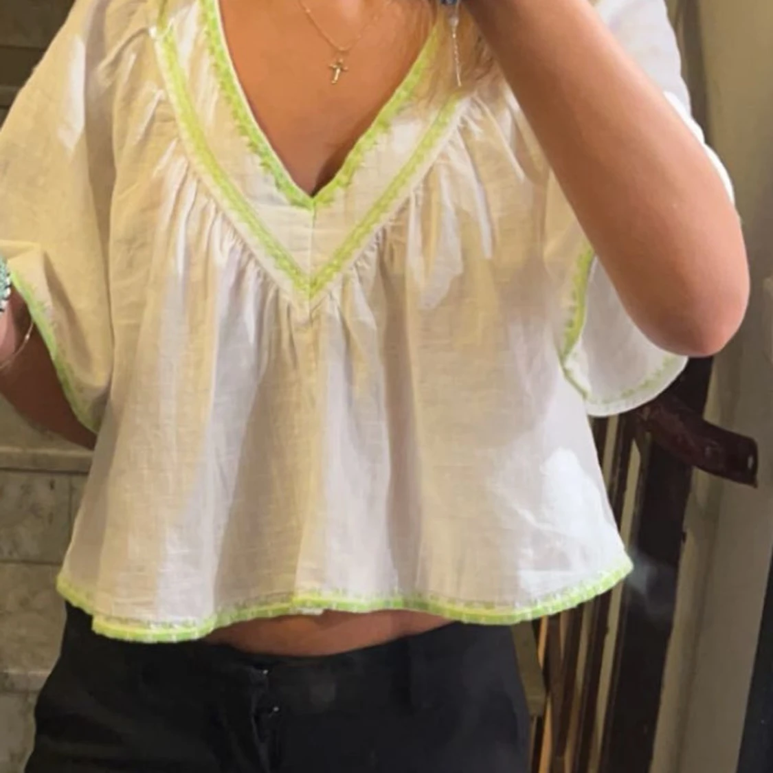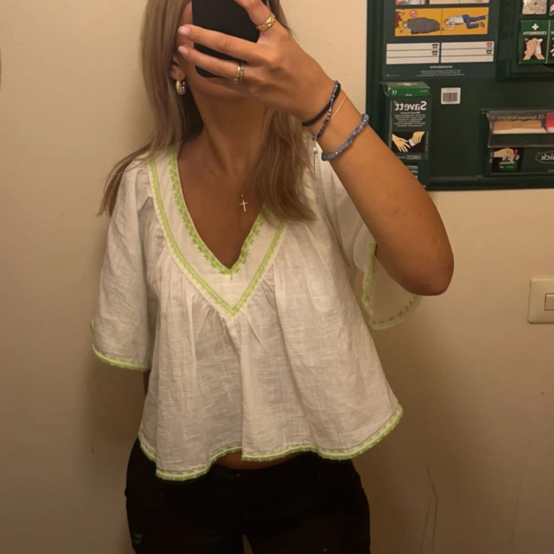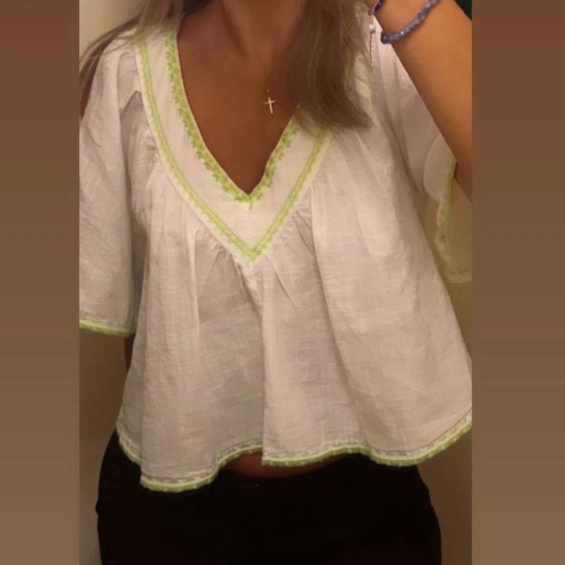 Säljer denna bohemiska blus med gröna broderade detaljer runt v-ringningen och ärmsluten. Blusen har en lös passform och korta ärmar, perfekt för varma dagar. Den är både stilren och bekväm.