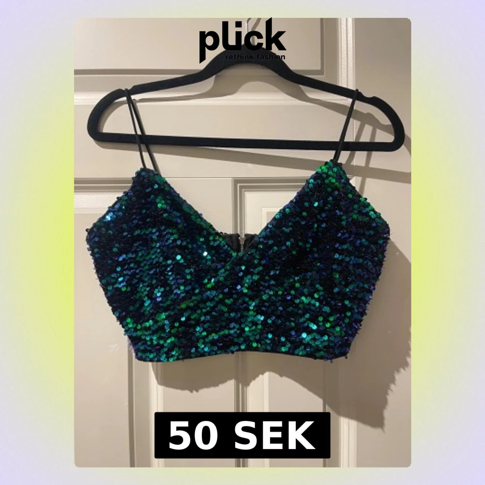 Säljer en glittrig croppad topp med tunna axelband, täckt av blå och gröna paljetter. Toppen har en snygg v-ringning och dragkedja bak för enkel på- och avtagning. Perfekt till nyårs!