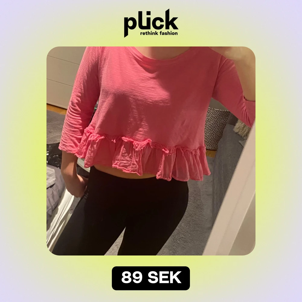 Säljer en söt rosa blus med volangdetaljer i nederkant. Blusen har långa ärmar och knappar på baksidan. Perfekt för vår och sommar!