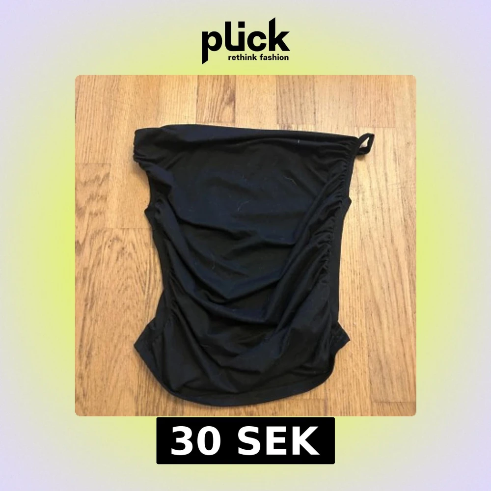 Säljer en svart bandeau tubtopp med draperad effekt på ena sidan och en liten ögla upptill. Toppen är axelbandslös och har en tight passform, perfekt för att skapa en clean och stilren look.