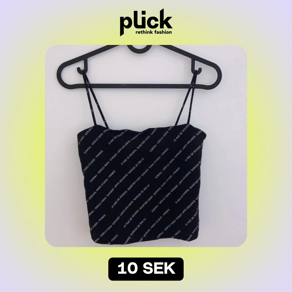 Snygg svart axelbandslös topp med tunna axelband och ett coolt textmönster i vitt. Perfekt för en utekväll eller fest. Toppen är i bra skick och har en tight passform som framhäver figuren.