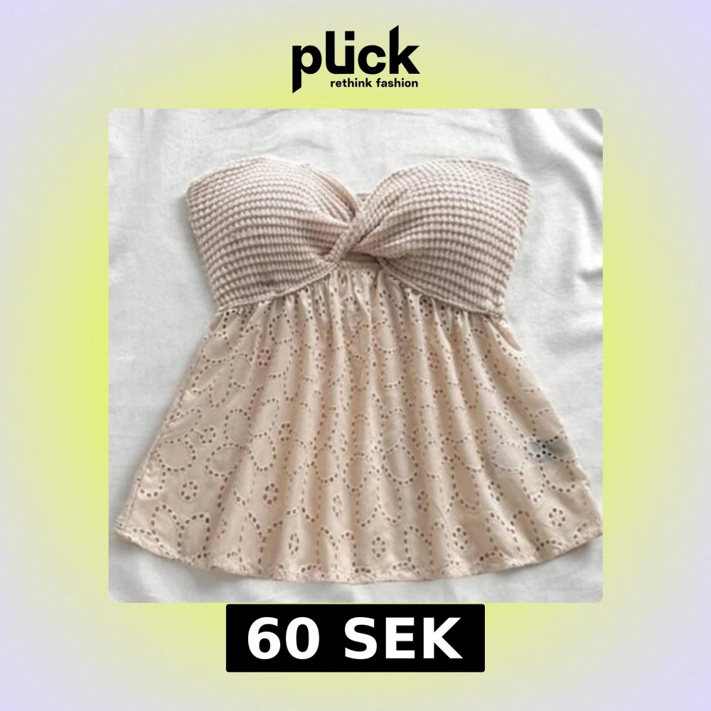 Söt beige tubtopp med virkad överdel och broderade blommor på den utsvängda nederdelen. Toppen är axelbandslös och har en twistad detalj framtill. Perfekt för varma dagar.