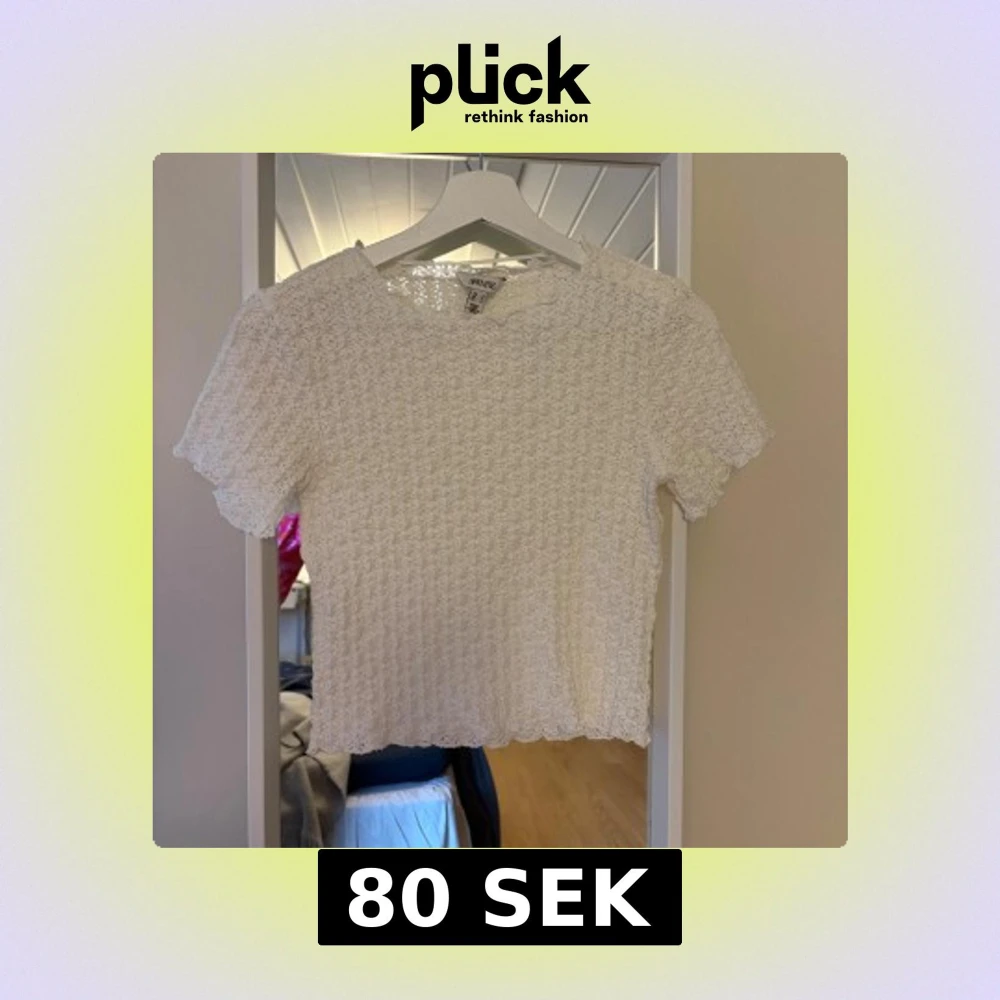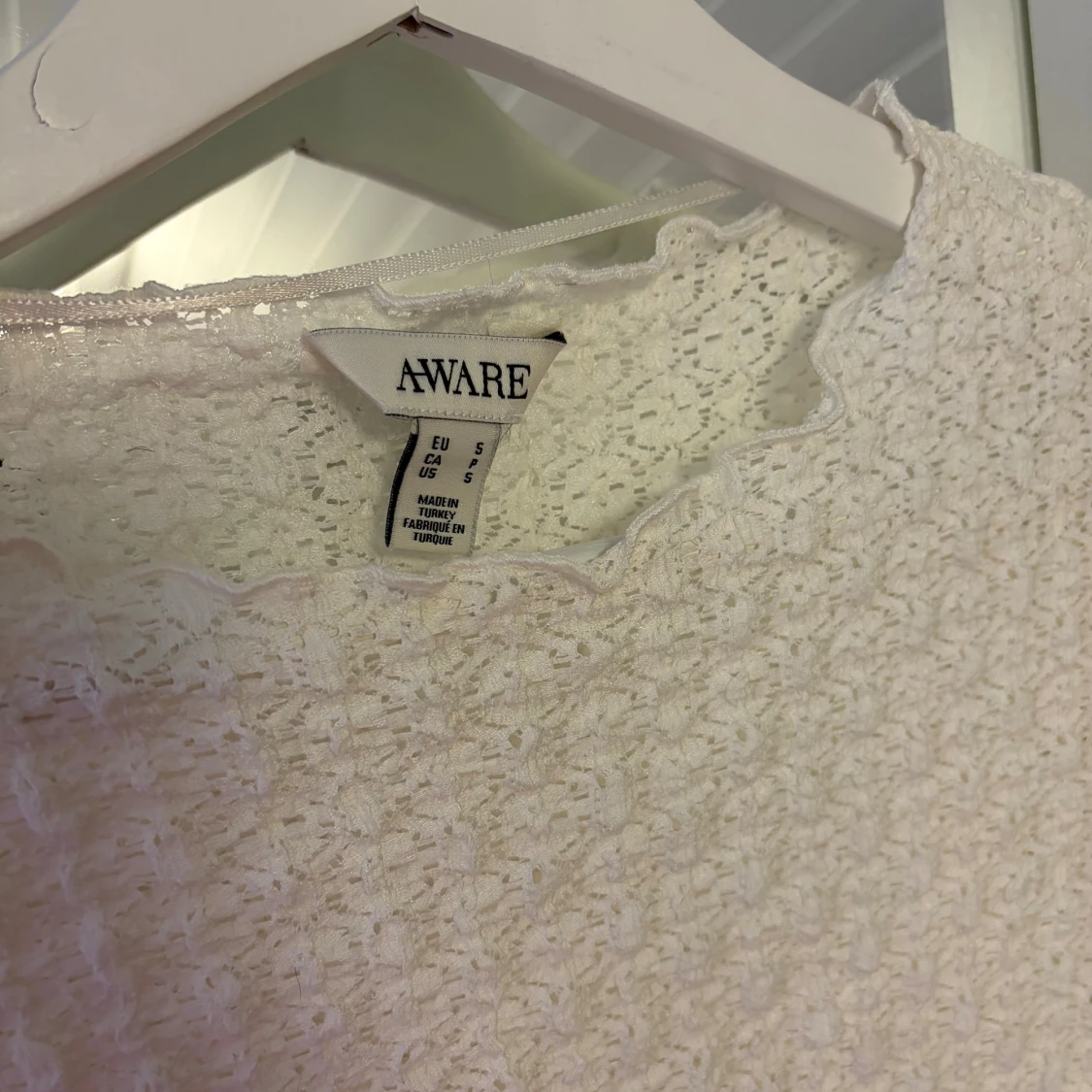 Säljer en söt vit blus från AWARE i storlek S. Toppen har korta ärmar och är helt täckt av ett fint spetsmönster med vågig kant vid halsringningen. Aldrig använd!💕