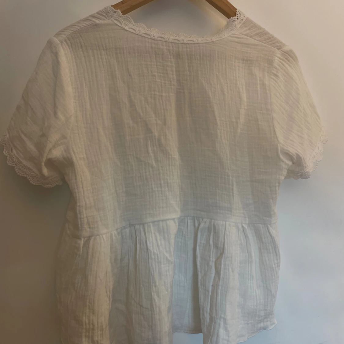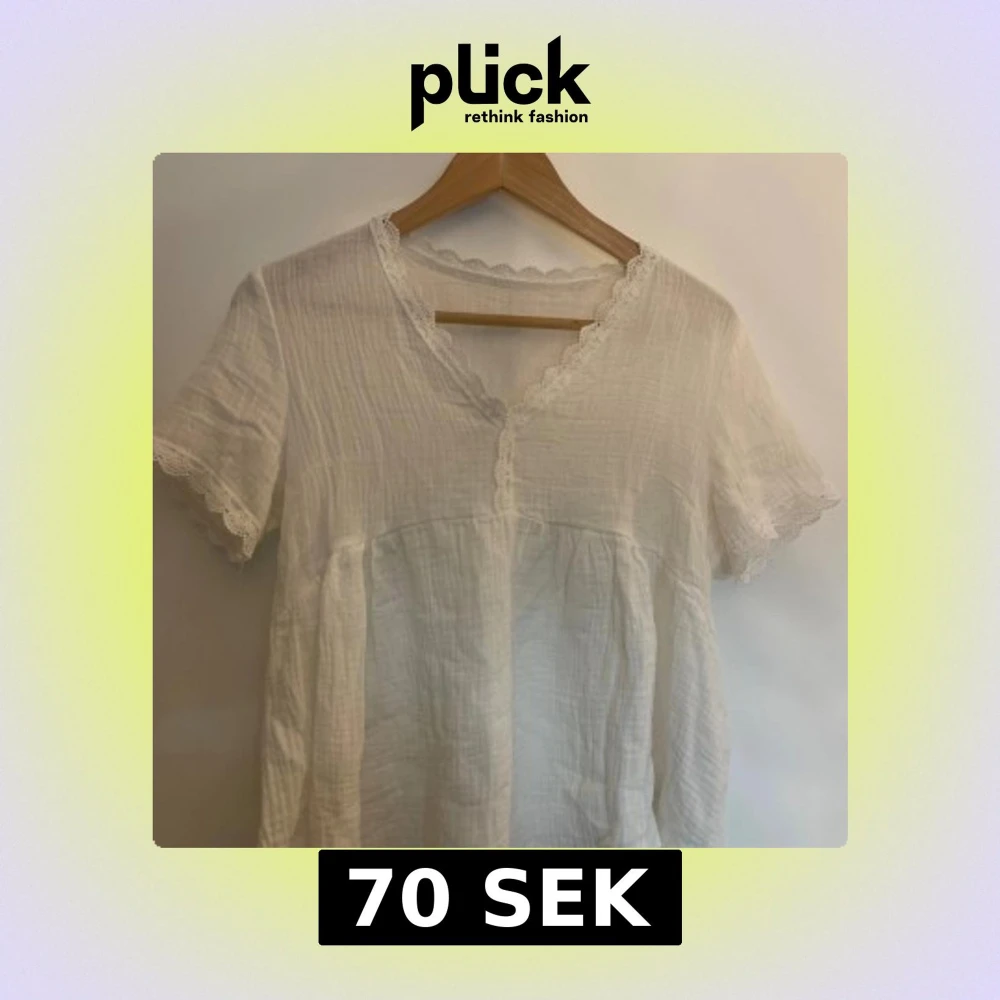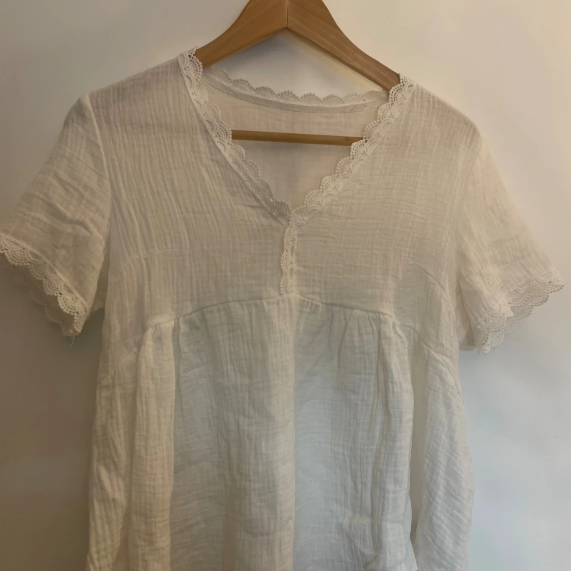 Säljer denna söta blusen i storlek S eftersom den inte kommer till användning. Blusen har spetsdetaljer längs halsringningen och en lätt rynkad nederdel för en luftig känsla. 💕