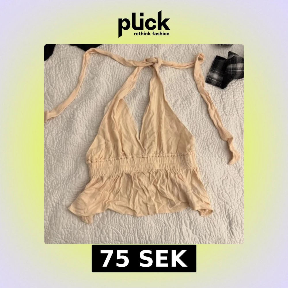 Snygg beige halterneck topp med knytband i nacken och smockdetaljer i midjan. Toppen har en lätt volangkant nedtill och är perfekt för varma dagar.