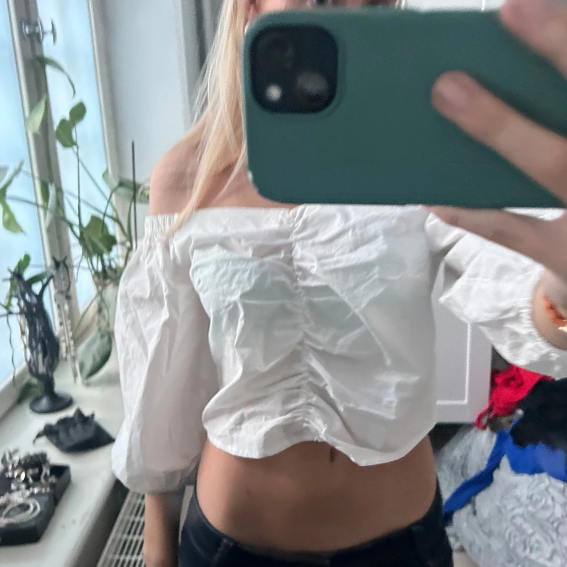 Säljer en stilren vit offshoulder blus med trekvartsärmar och rynkdetalj framtill🙏🏽😍