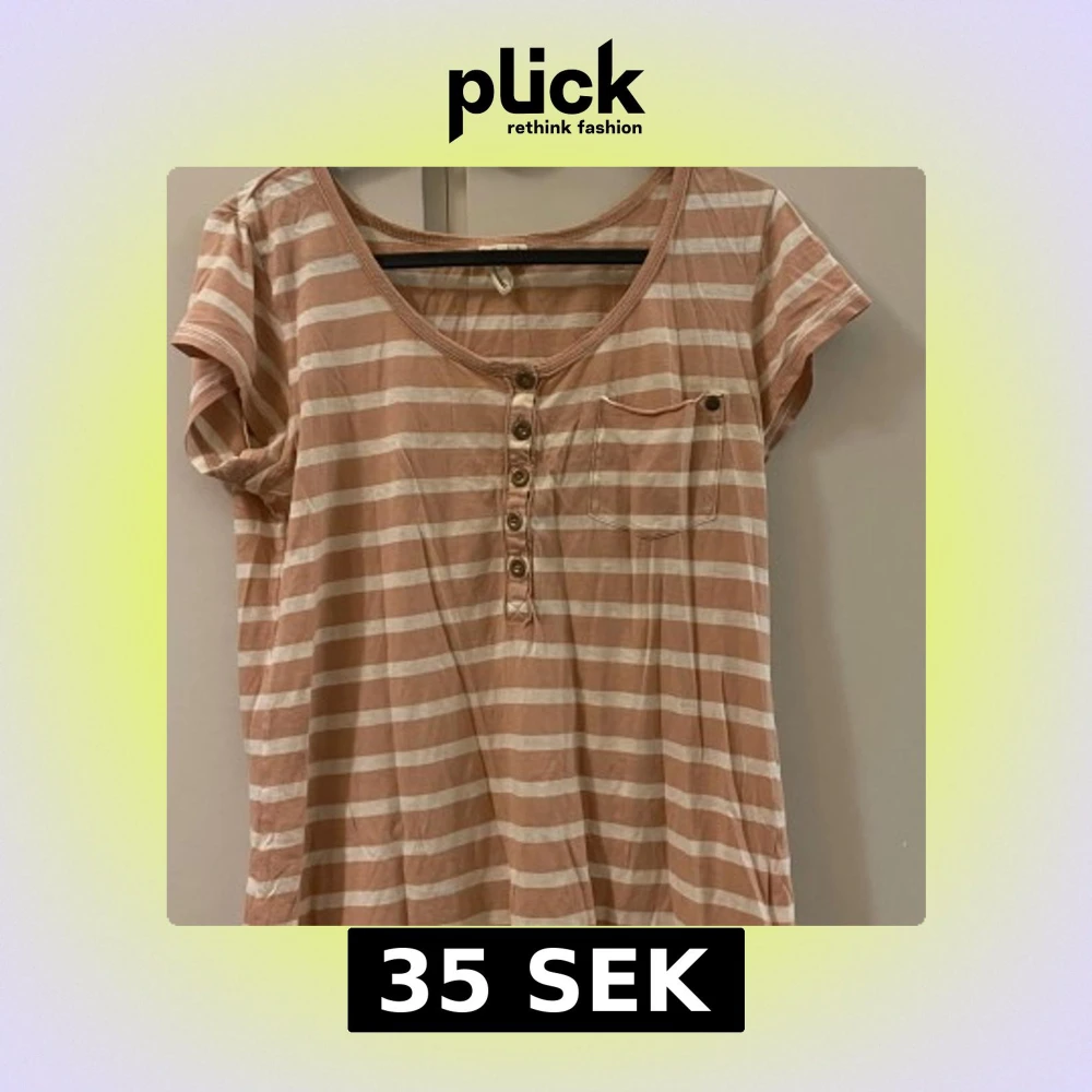 Säljer en randig kortärmad topp i beige och vit med knappar framtill och en bröstficka. Perfekt för en avslappnad stil.