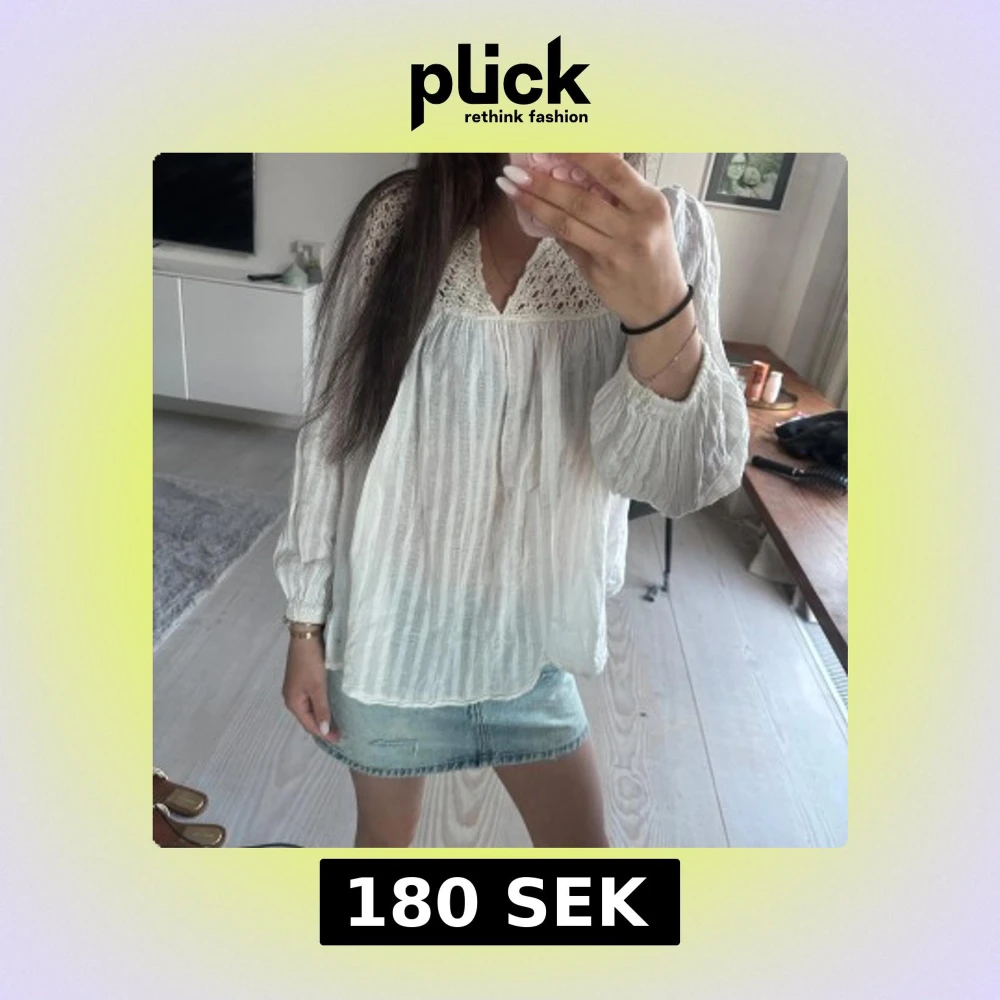 Säljer en luftig vit blus med vackra spetsdetaljer vid halsringningen. Blusen har långa ärmar med resår vid ärmslut och en lös passform. Perfekt för vår och sommar!