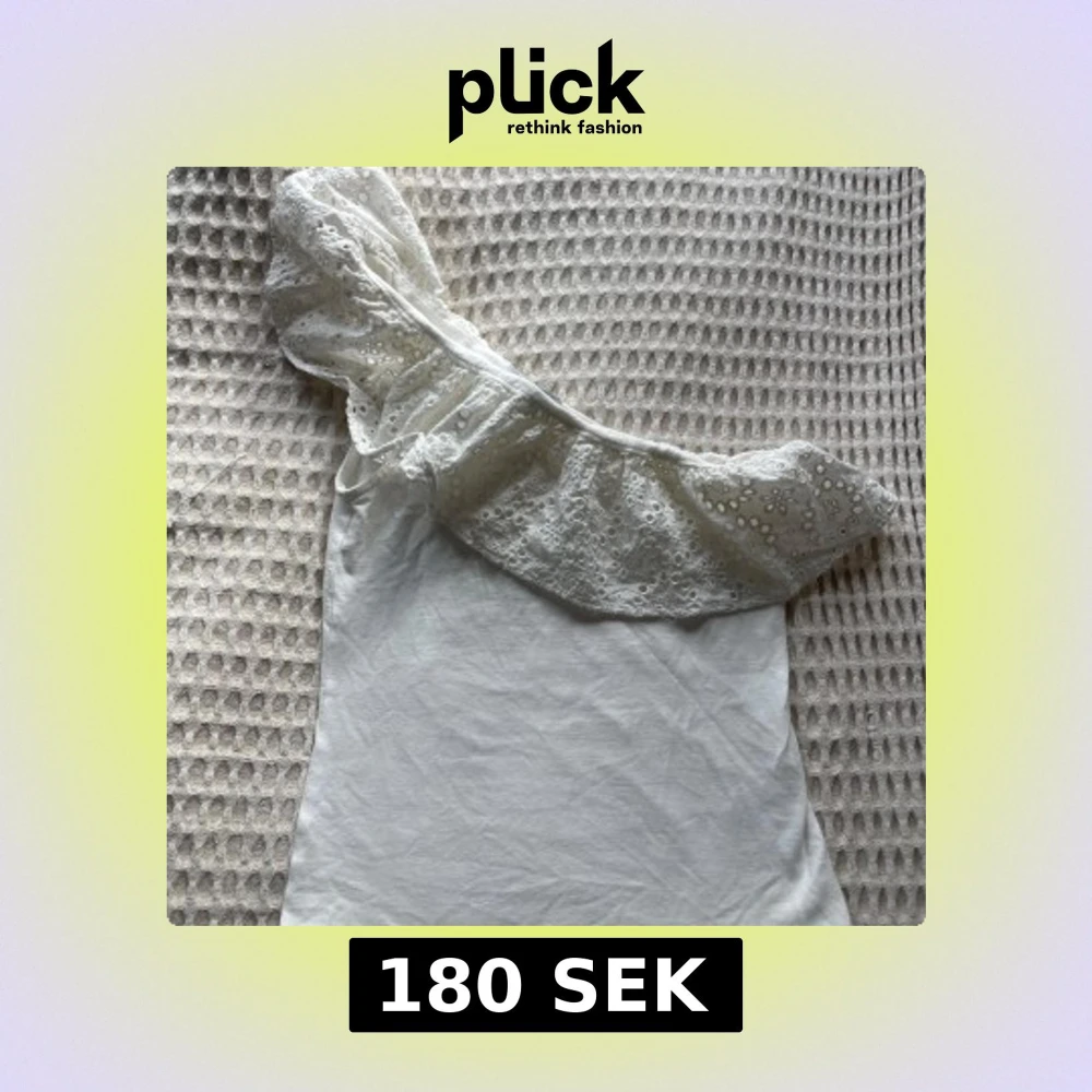 Säljer en vit oneshoulder topp från Holly & White med bred volang i spets och broderade blommor. Perfekt för dig som vill ha något unikt och somrigt med fina detaljer.