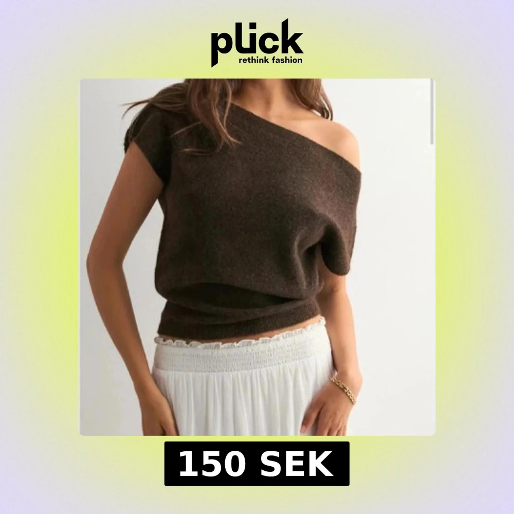 Säljer en brun stickad topp med offshoulder-design. Toppen har en loose passform och är ärmlös, vilket ger en chill och trendig vibe. Perfekt att styla med höga kjolar eller jeans för en cool look.