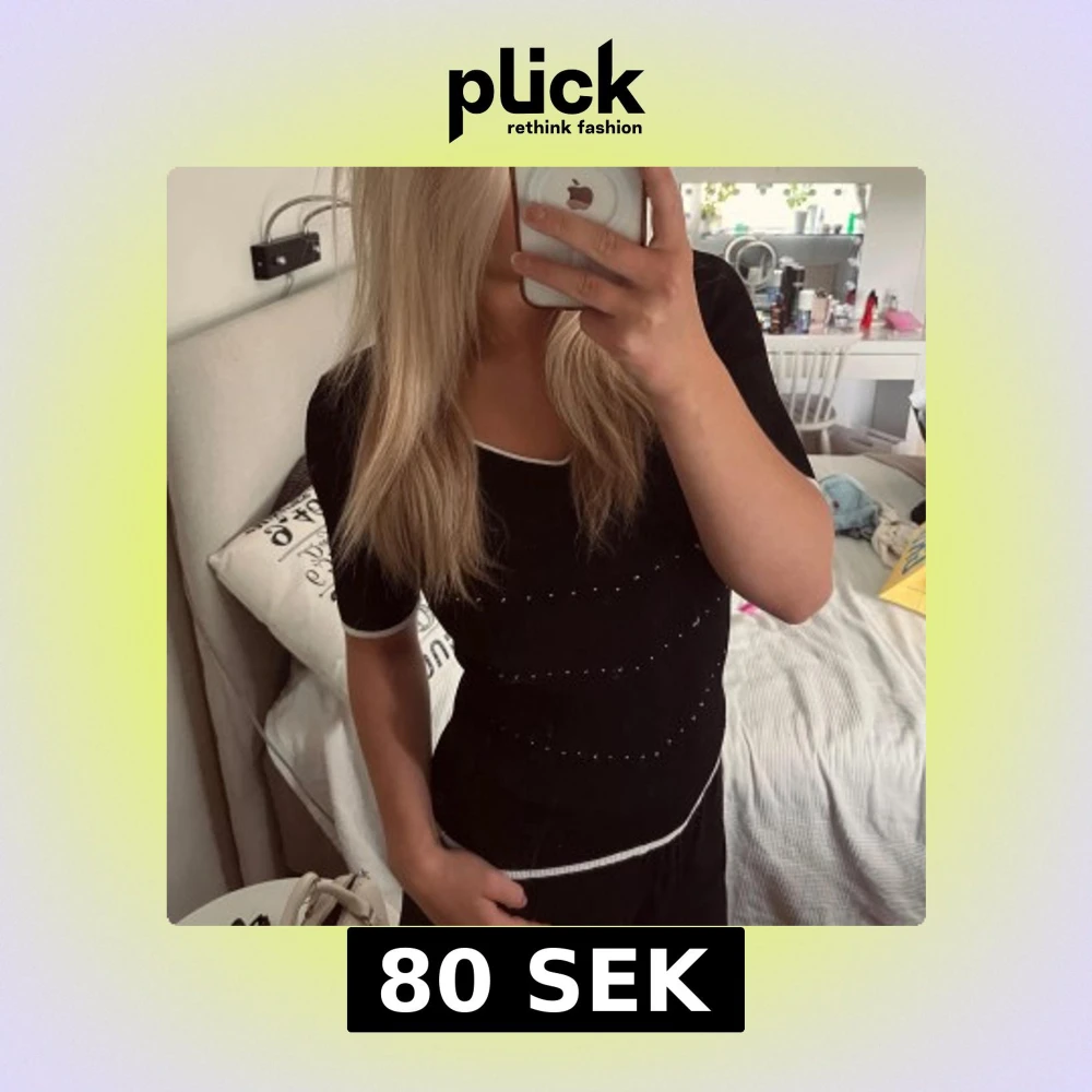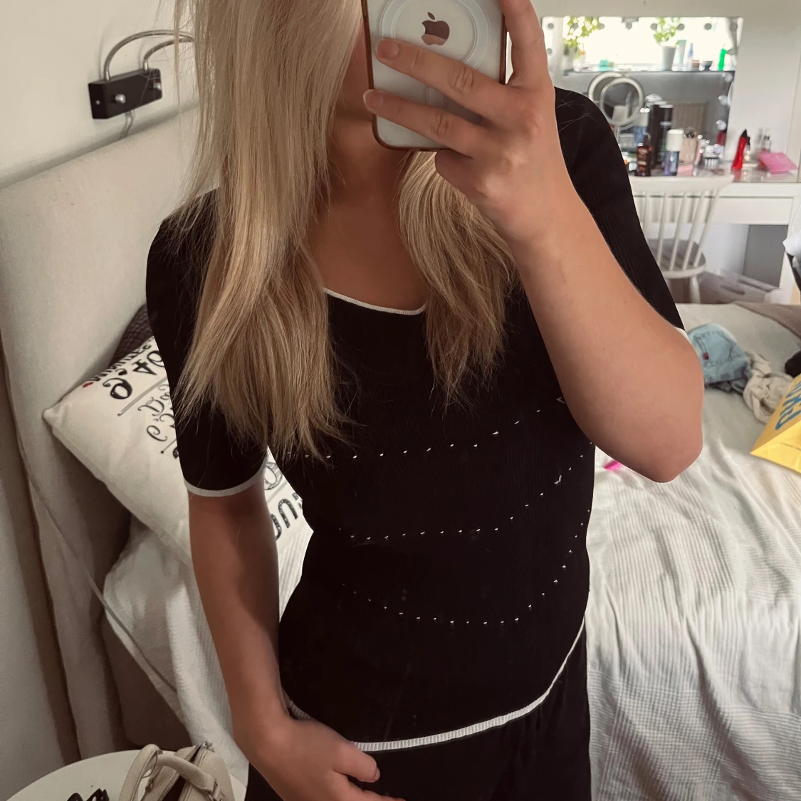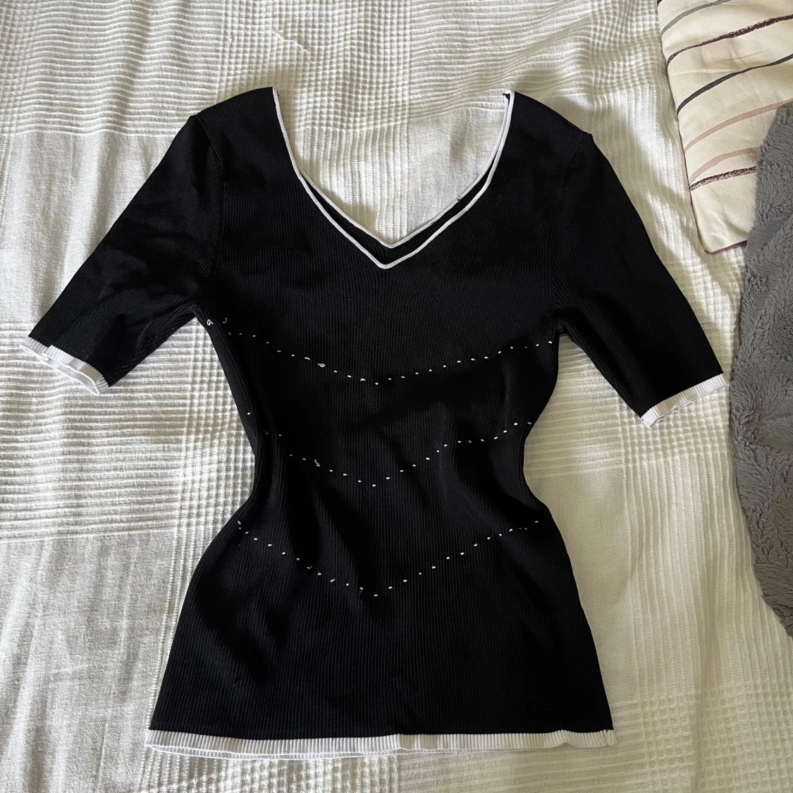 Snygg svart ribbad topp med vita kontrastsömmar och små prickar i rader över bröstet och midjan. Söt topp som är enkel att styla! Toppen passar mig som vanligtvis bär S/M i toppar🖤🖤