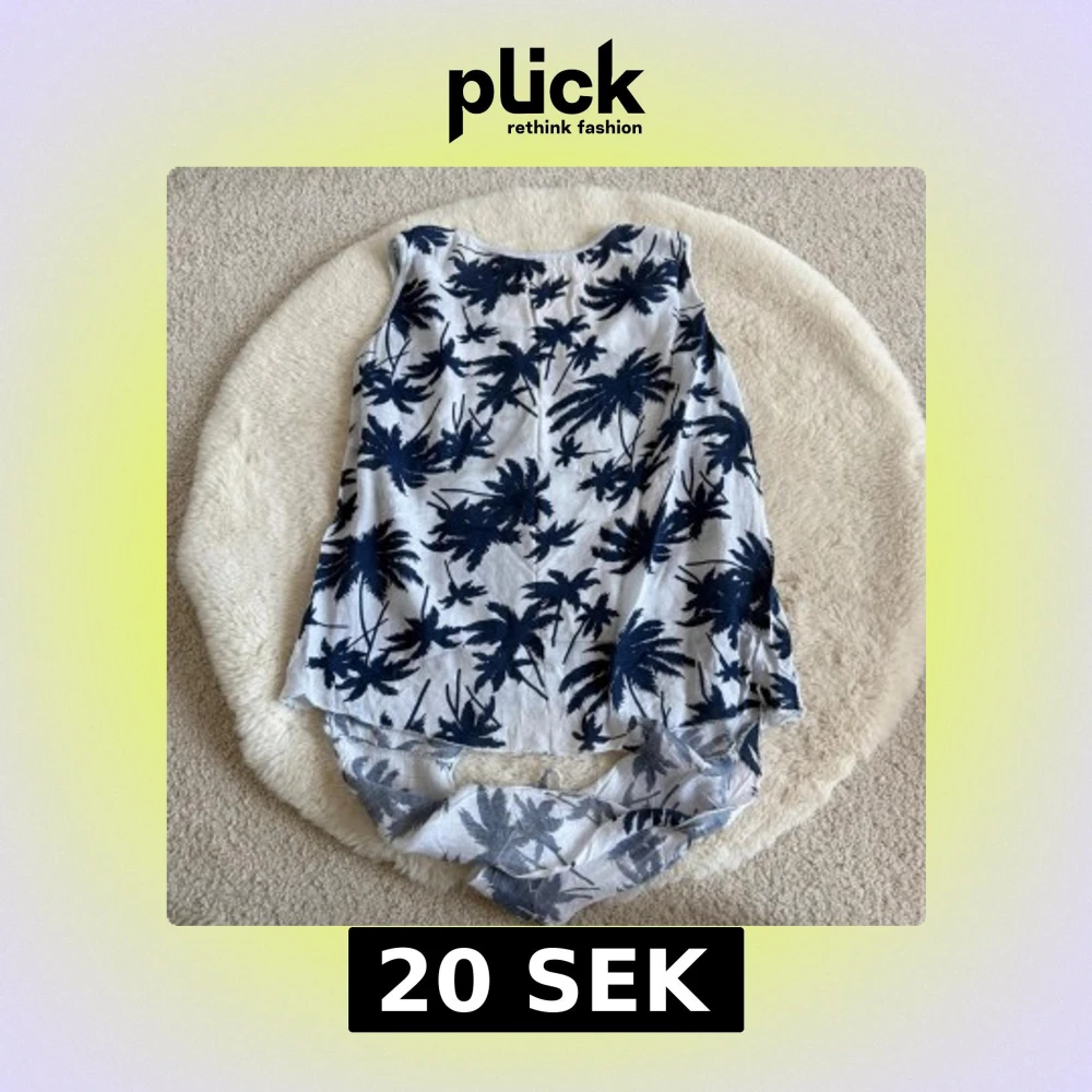 Snygg ärmlös linnetopp med palmmönster i mörkblått på vit bakgrund. Toppen har ett knyt framtill som ger en cool och avslappnad look. Perfekt för varma dagar och sommarhäng.