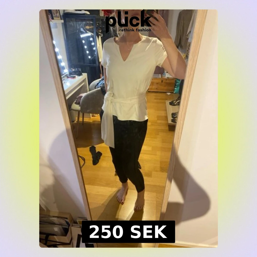 Stilren vit kvalitetstopp med korta ärmar och knytband i midjan. Lite tjockare tyg som ger en lyxigare känsla. Knytbandet kan man välja att ta bort för att få en rak modell.