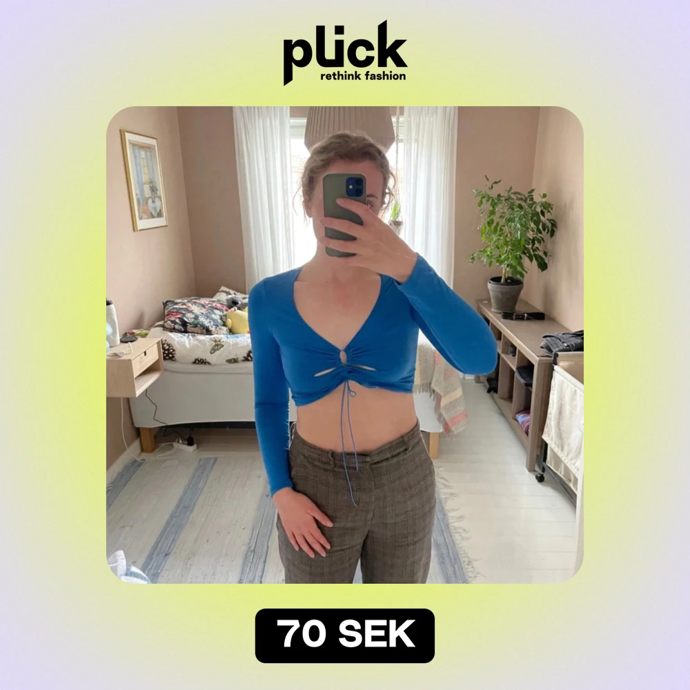 Säljer en snygg blå croppad topp med lång ärm och knytning framtill. Toppen har en djup v-ringning och är i ett mjukt och stretchigt material.
