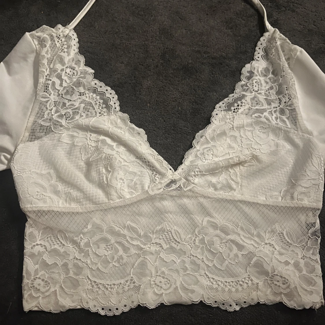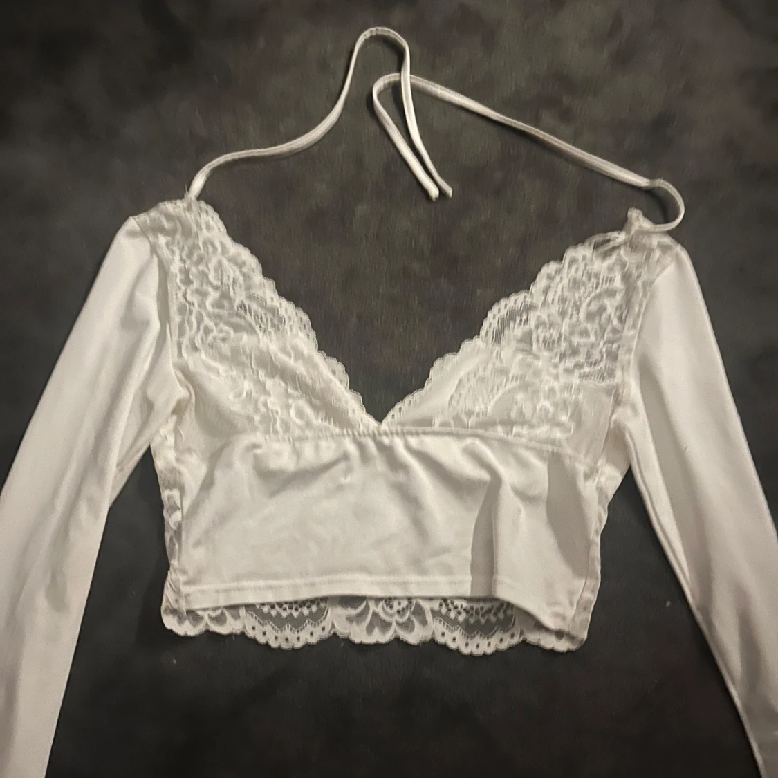 Superfin vit croppad topp med långa ärmar och spetsdetaljer framtill och baktill. Djup v-ringning i både baksida och fram och knytband i nacken ger en snygg och feminin look. Perfekt för dig som gillar romantiska vibes och vill sticka ut lite extra.