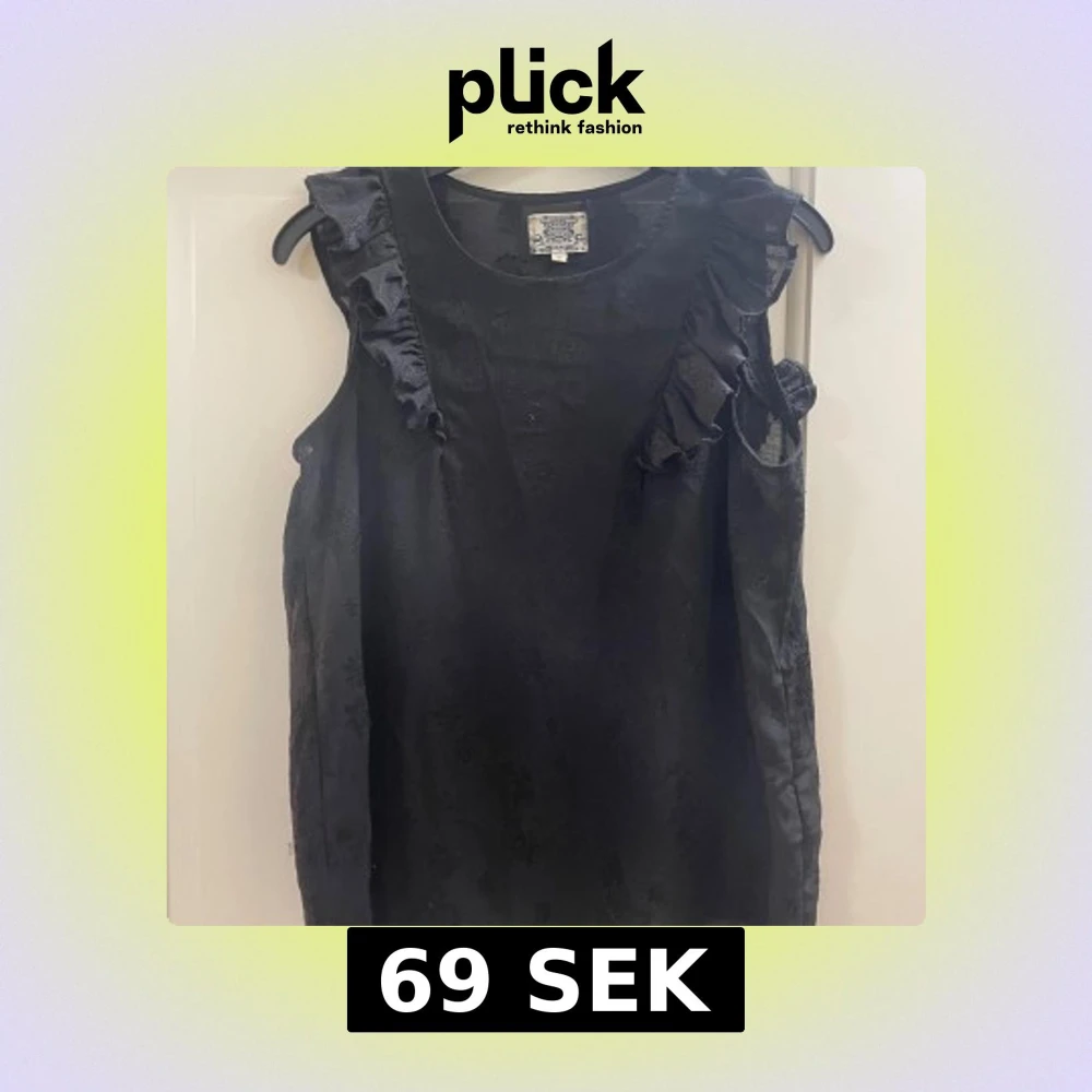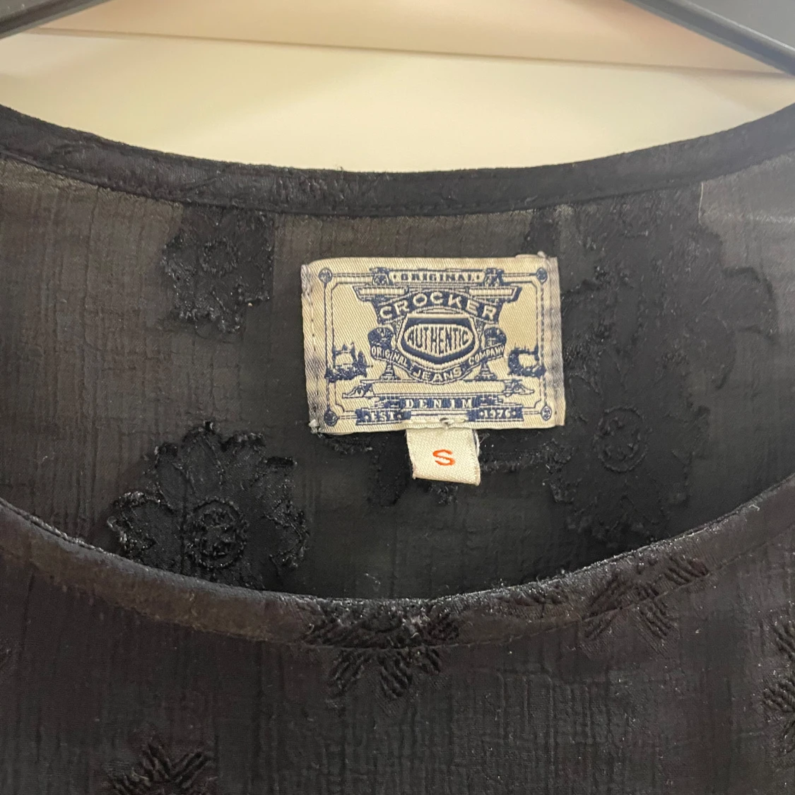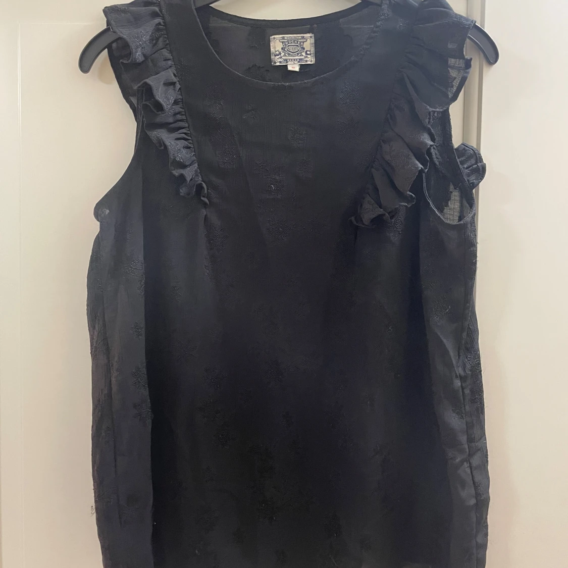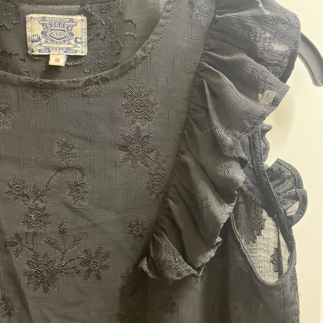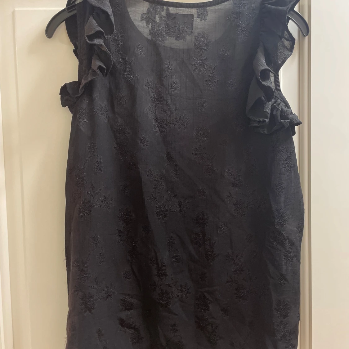 Supersöt svart blus från Crocker med broderade blommor och volangdetaljer vid axlarna. Ärmlös modell i lätt och luftig bomull, perfekt för dig som gillar en feminin och chill stil. Rund halsringning och snygg struktur i tyget. Storleken är S och den har inga defekter alls!!