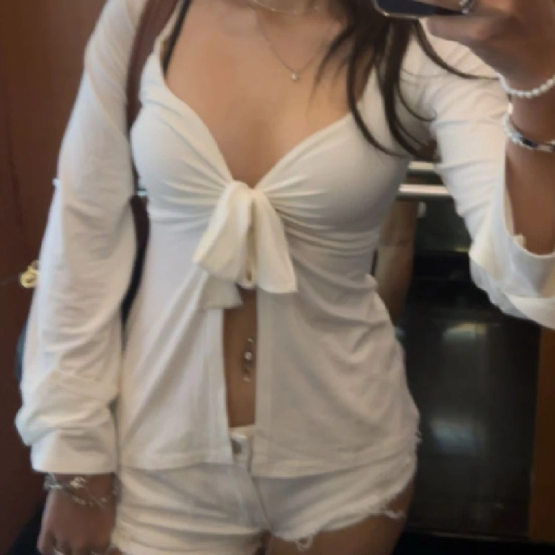 Supersnygg vit omlottopp med lång ärm och djup v-ringning. Toppen har knyt framtill som ger en trendig och feminin look. Perfekt till shorts eller jeans för en cool sommarstil.