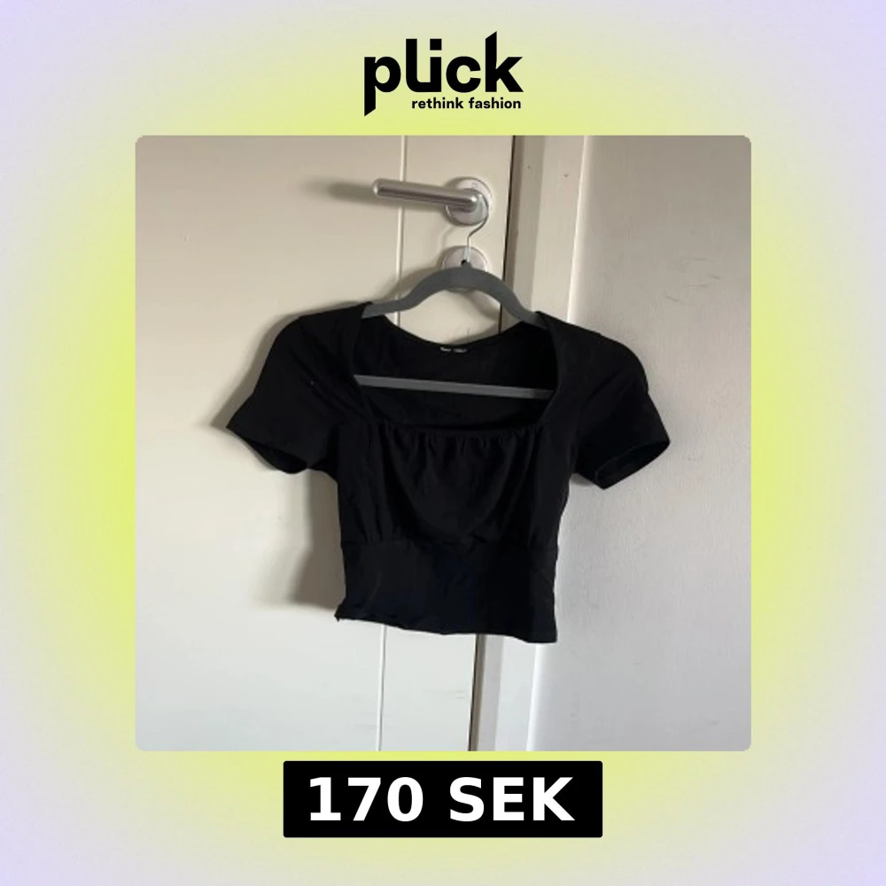 Snygg svart croppad topp med korta ärmar och fyrkantig ringning. Toppen har en lätt rynkad detalj framtill och är figurnära i modellen. Perfekt att matcha med höga jeans eller kjol för en trendig look.