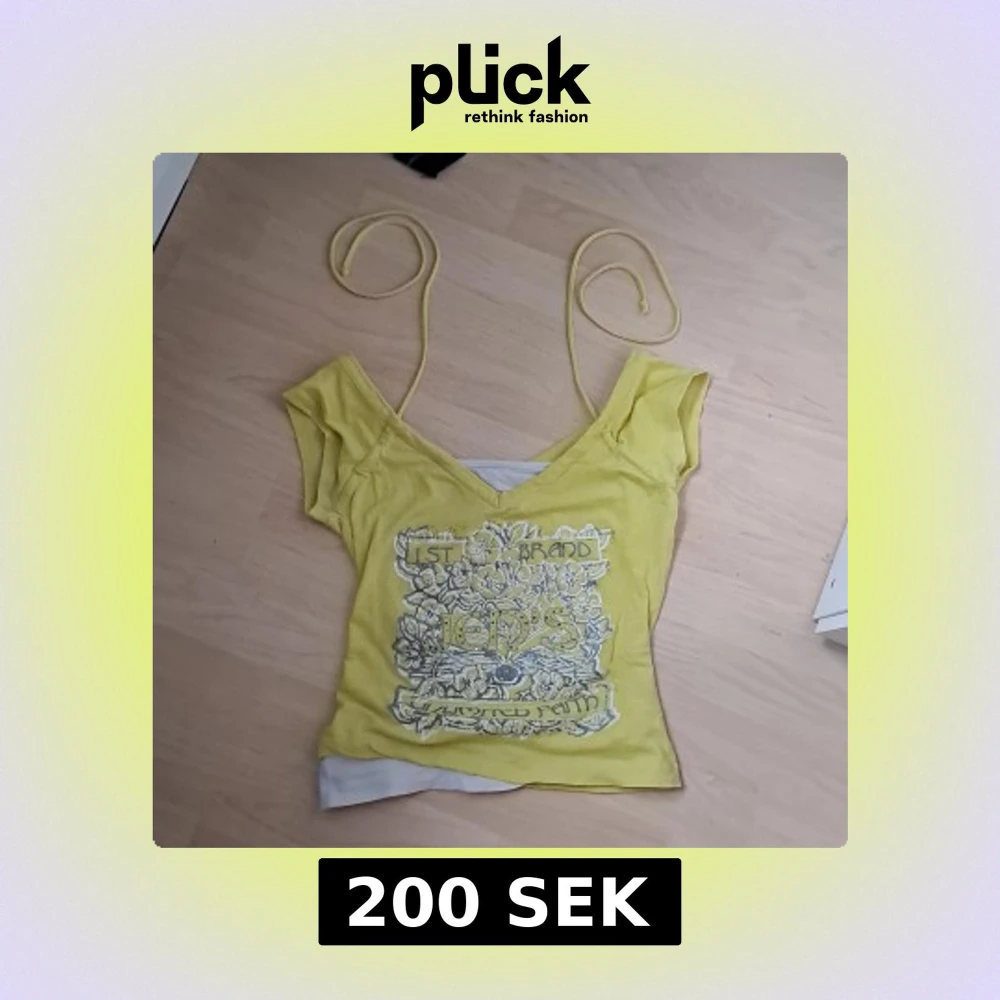 Säljer en gul linnetopp från Jennyfer i storlek S. Toppen har smala axelband, v-ringad hals och ett stort blommigt tryck med texten '1st Brand' framtill. Materialet är mjuk bomull och toppen har en figurnära passform. Perfekt för dig som gillar färg och coola detaljer!