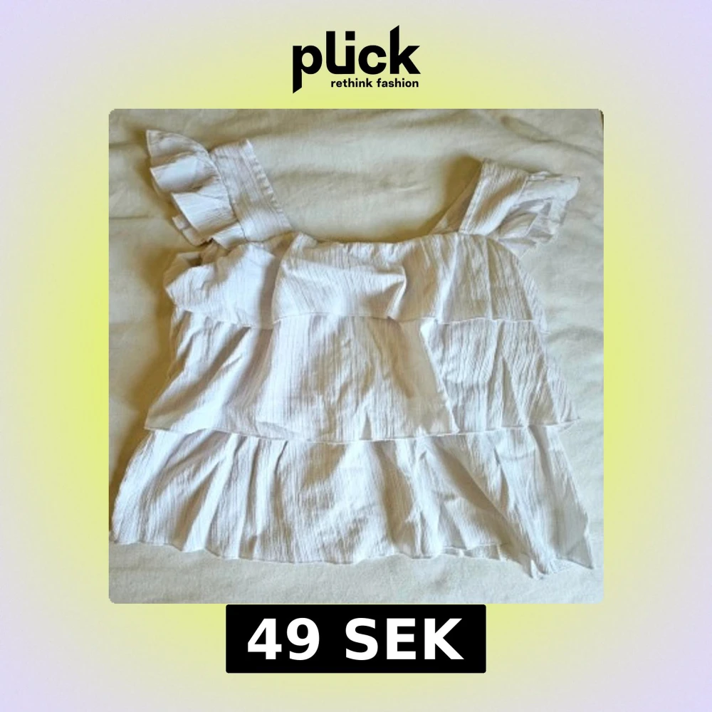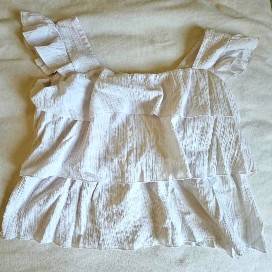 Säljer en söt vit blus med breda axelband och volangdetaljer. Toppen har en luftig och flowy passform med flera lager volanger som ger en romantisk vibe. Perfekt för varma dagar och att styla med jeans eller kjol.