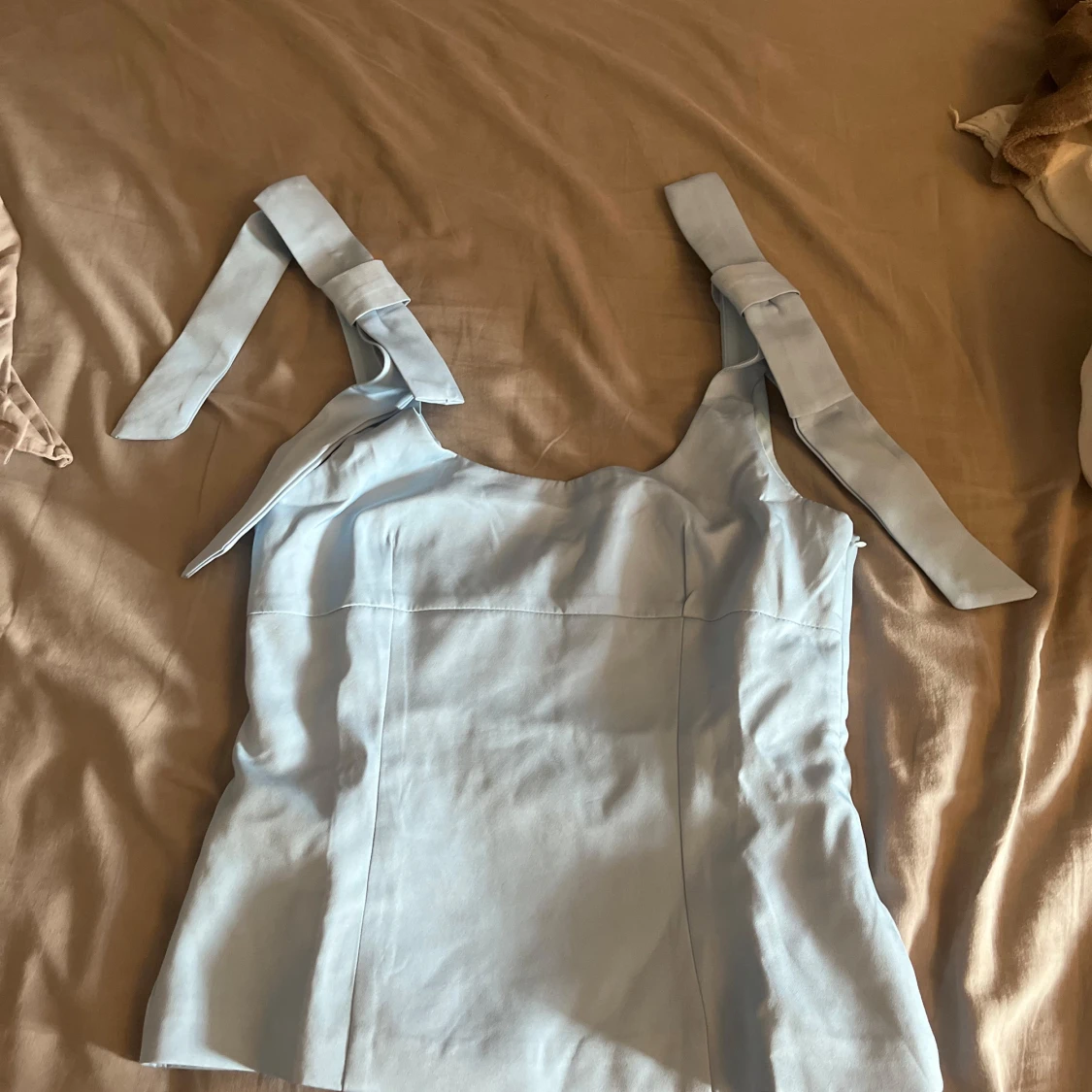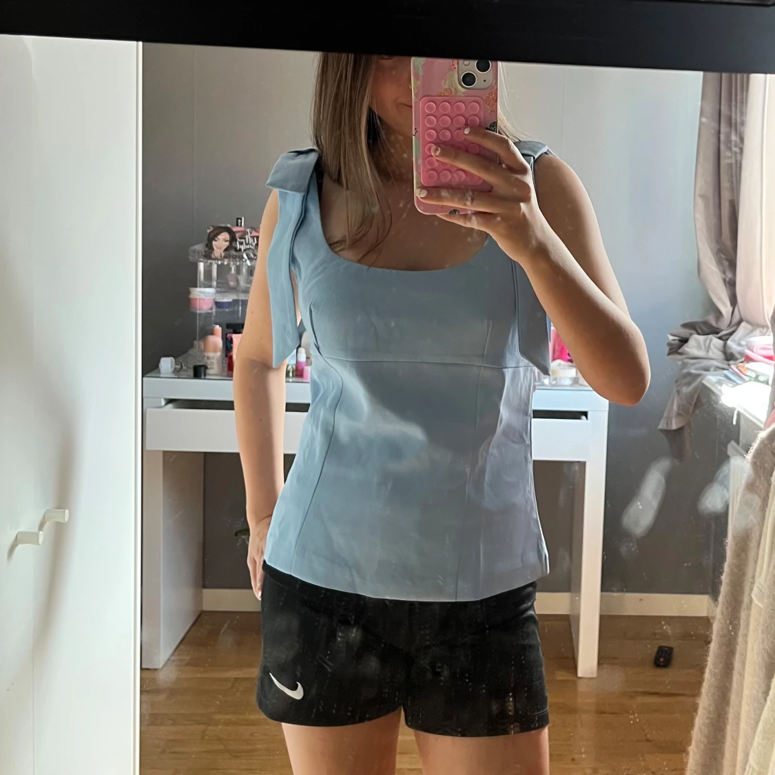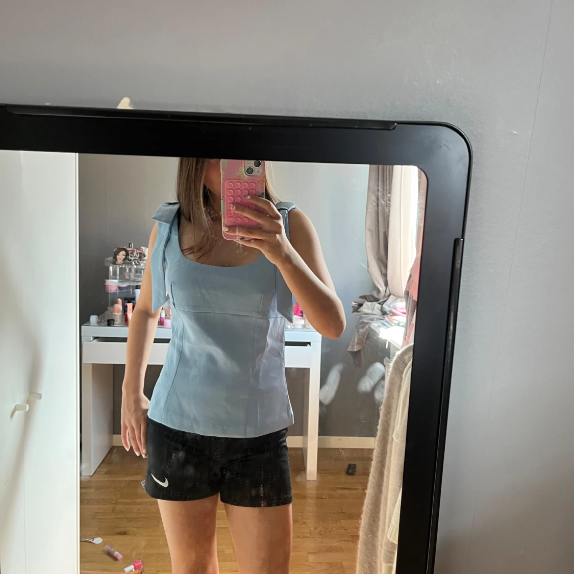 Supersöt ljusblå linnetopp med breda axelband som knyts till rosetter på axlarna. Toppen har en figurnära passform och fyrkantig ringning. Även en dragkedja på sidan! Endast testad❤️