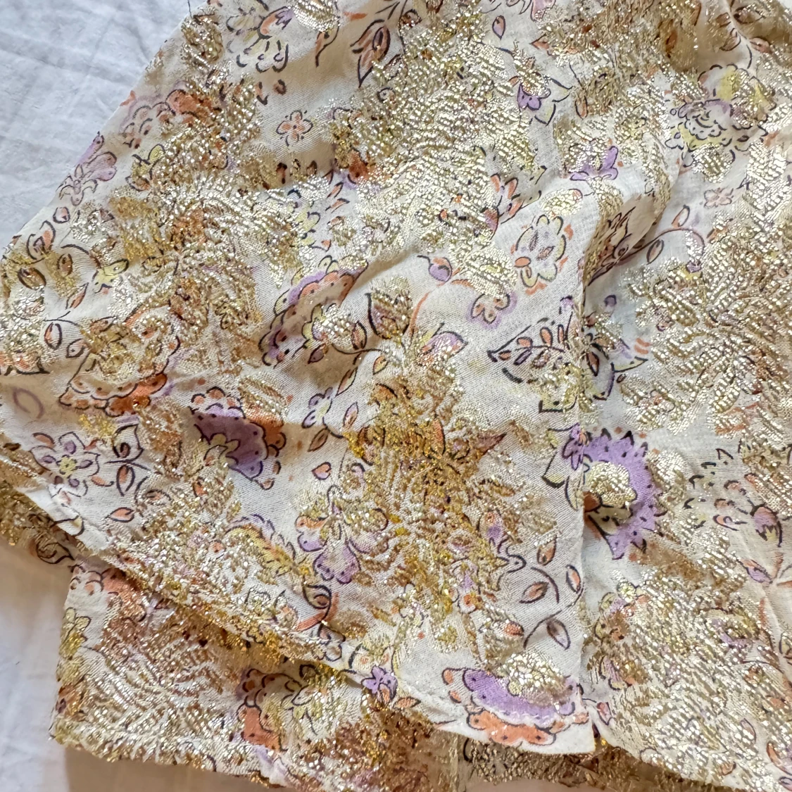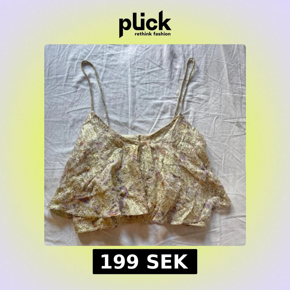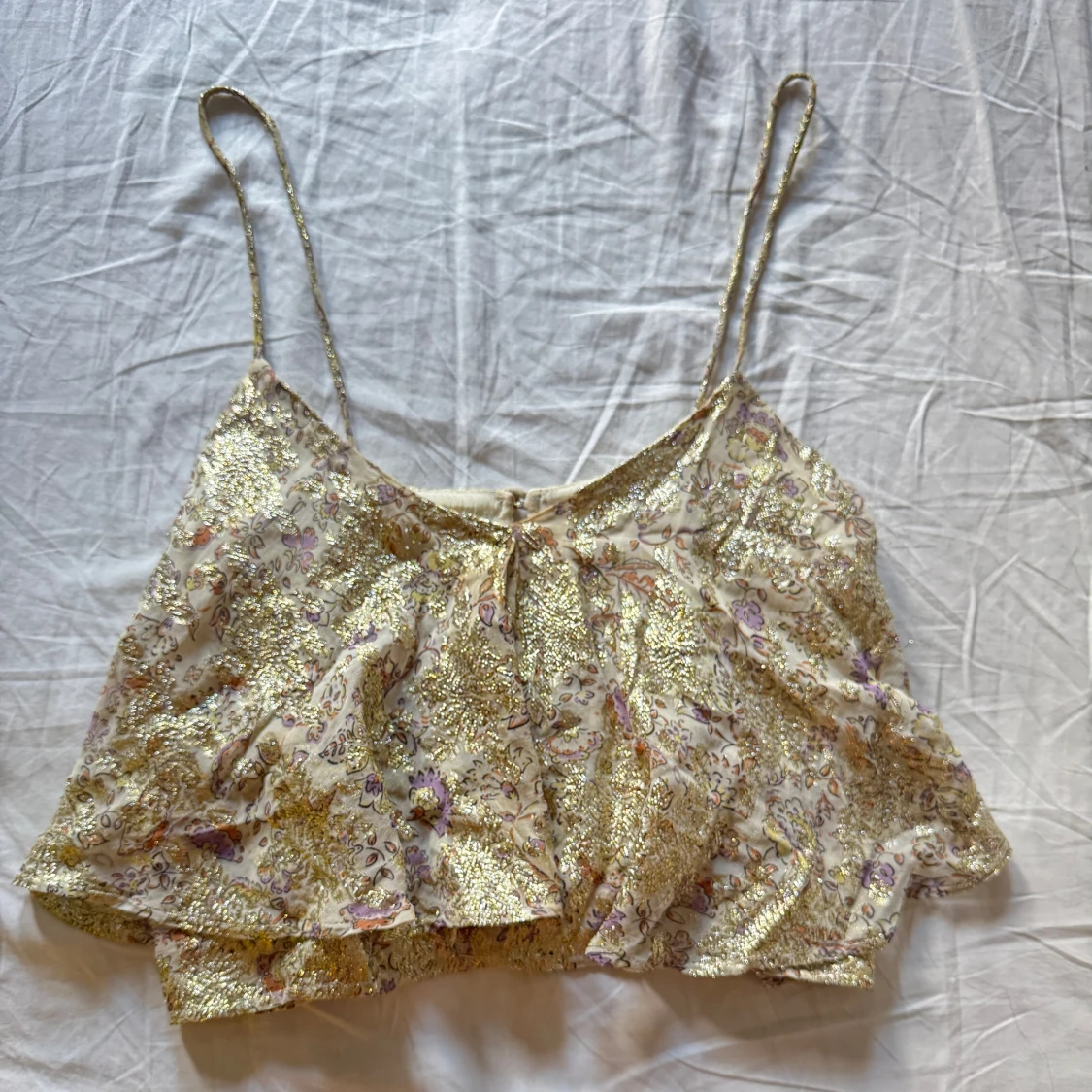 Supersöt croppad linnetopp med tunna axelband och volangig passform. Toppens tyg är blommigt med inslag av guldglittriga detaljer i hela mönstret, och färgerna går i ljusa toner av beige, lila och rosa. Perfekt för dig som vill sticka ut med en unik och glittrig look.