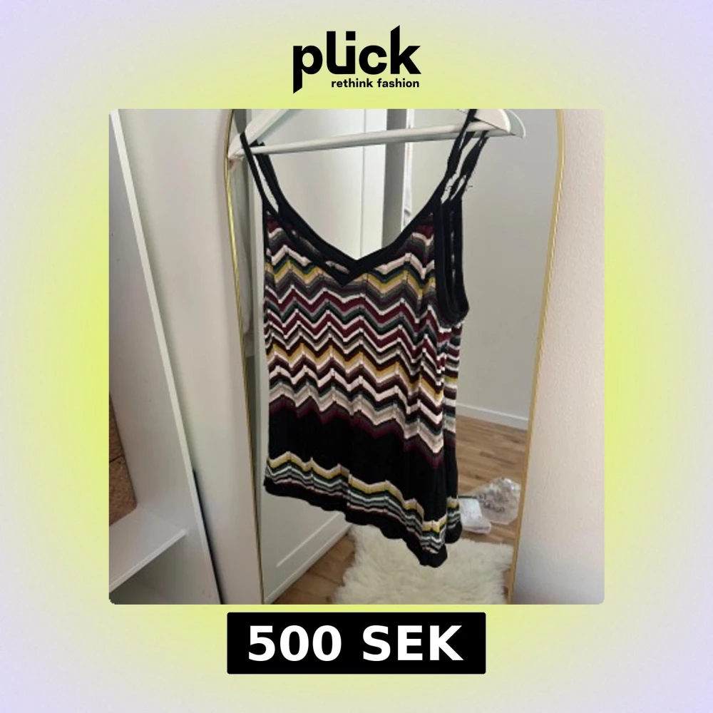 Säljer en ikonisk linnetopp från Missoni med färgglatt zigzag-mönster i svart, vinröd, gul, beige, blå och silver. Tunt stickat material med smala axelband och v-ringning. Perfekt för dig som vill sticka ut med en färgstark och trendig look.