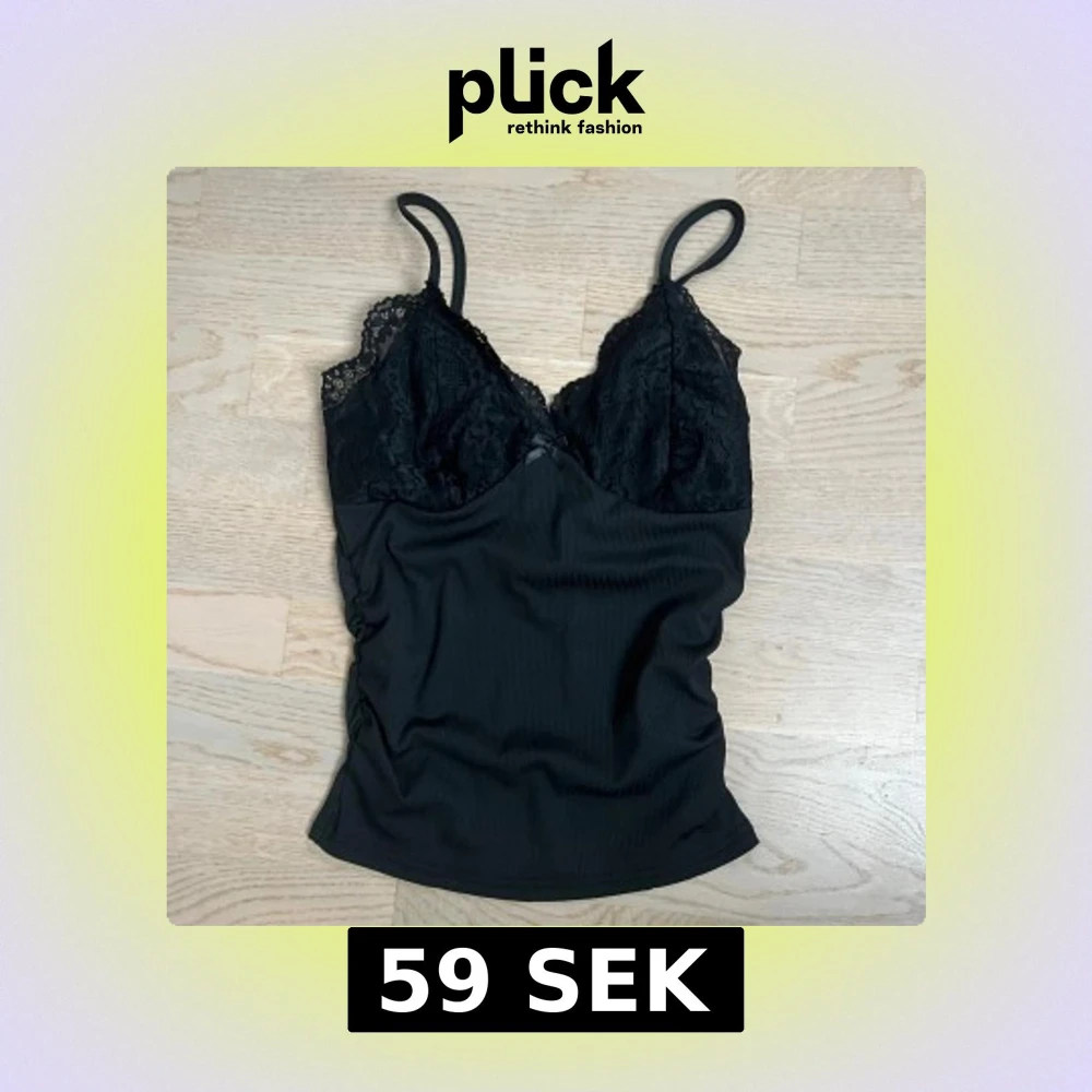 Snygg svart linne-topp med smala axelband och spetsdetaljer över bysten. Toppen har en liten rosett framtill och ribbad struktur i tyget.