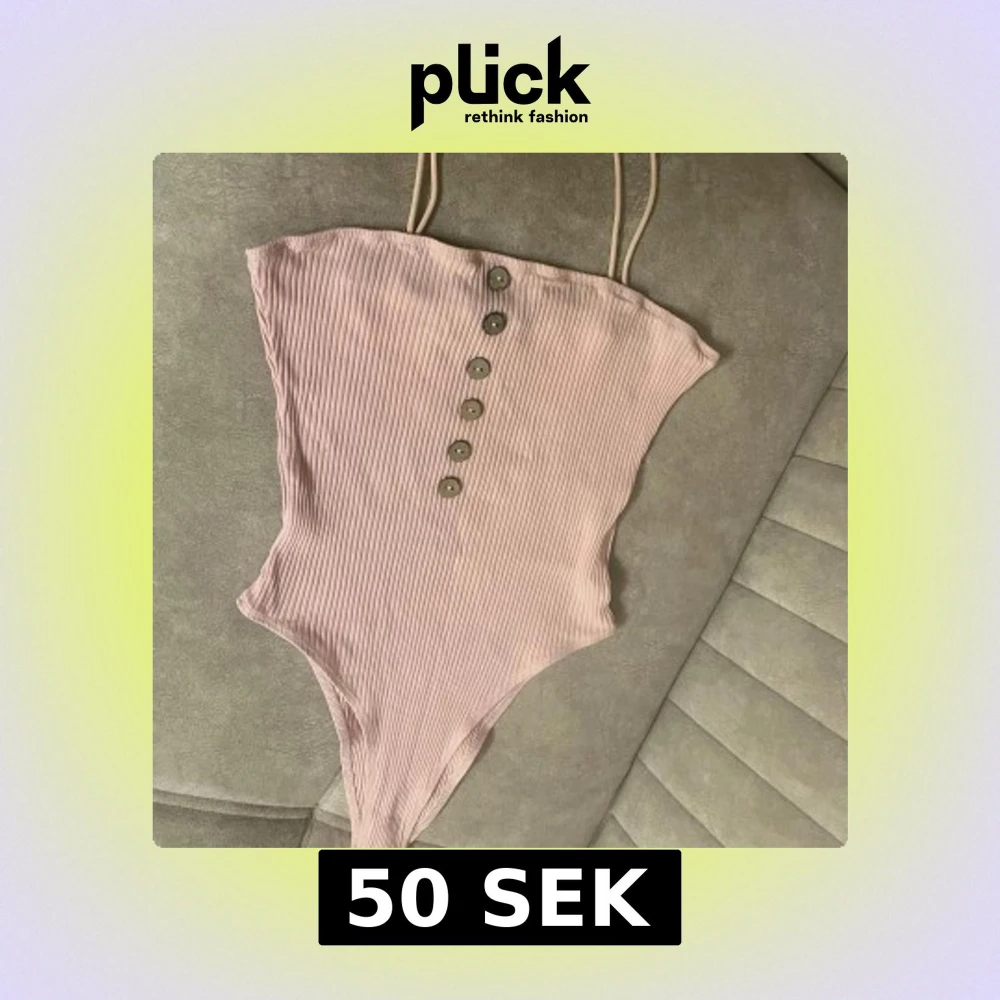 Supersnygg ljusrosa body med ribbad struktur och sex dekorativa knappar framtill. Modellen har smala axelband och en stilren, enkel form som ger en modern vibe. Oanvänd