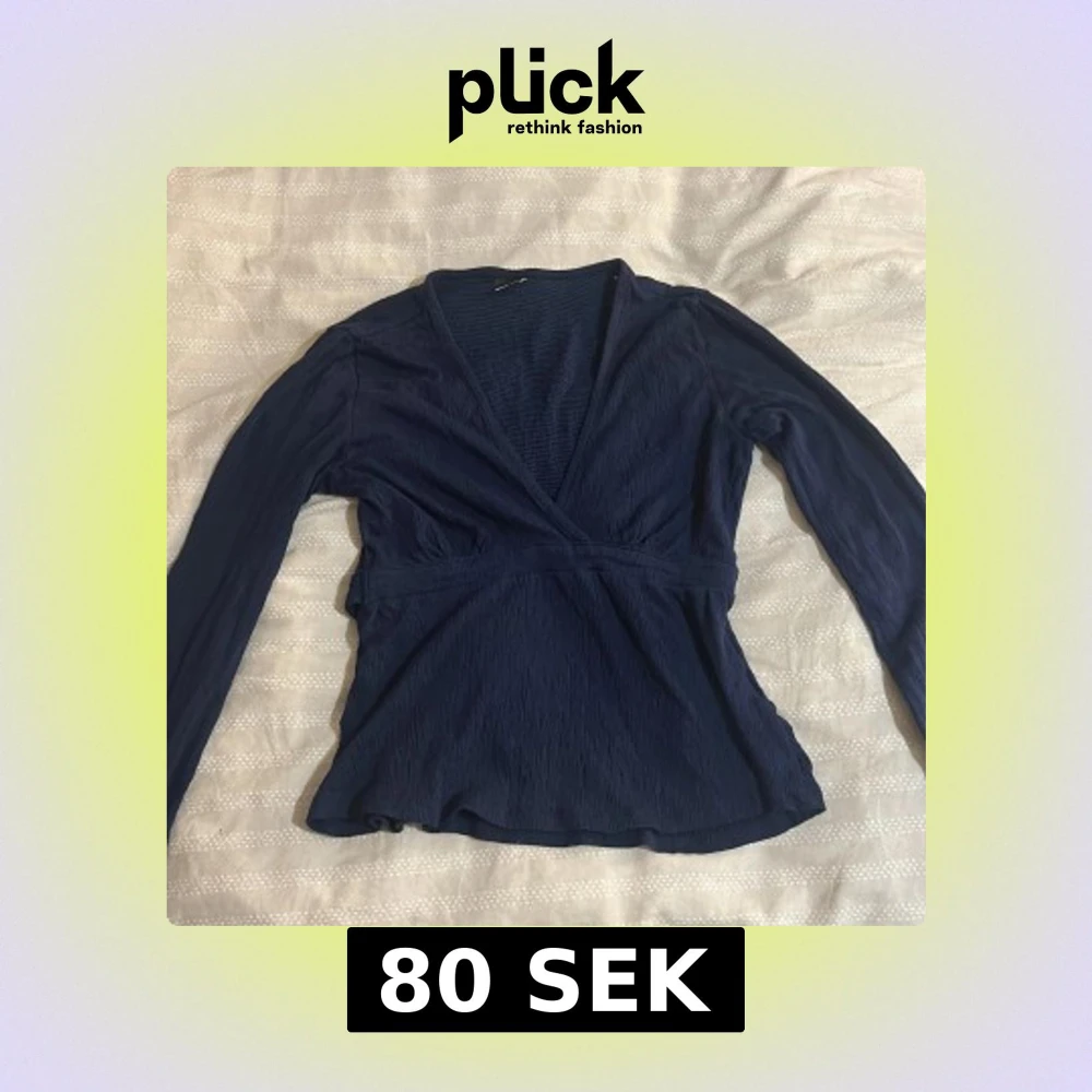 Snygg mörkblå omlottopp med lång ärm och djup v-ringning. Toppen har en lätt strukturerad yta och markerad midja som ger en smickrande siluett. Perfekt att styla med jeans eller kjol för en trendig look.
