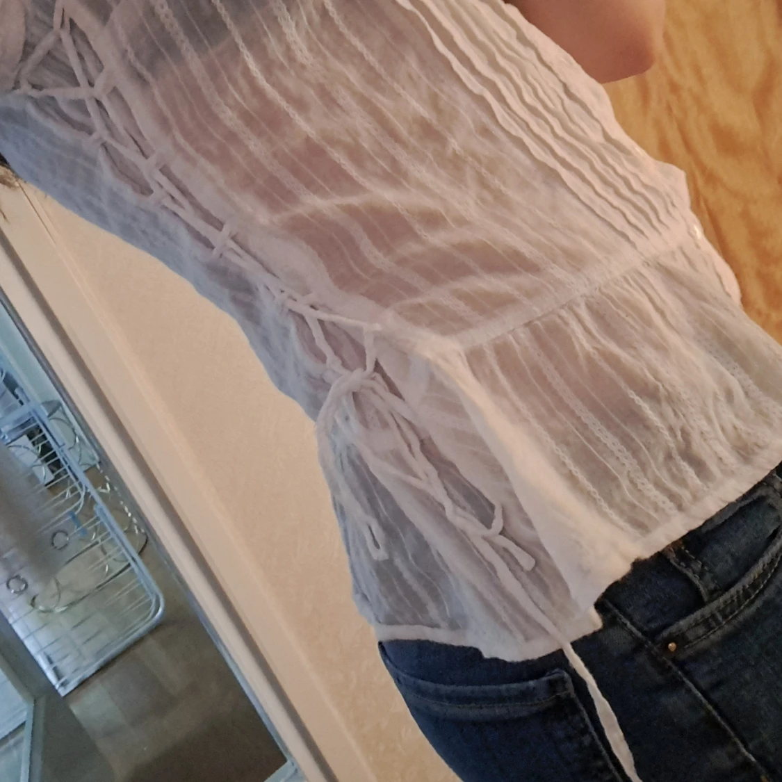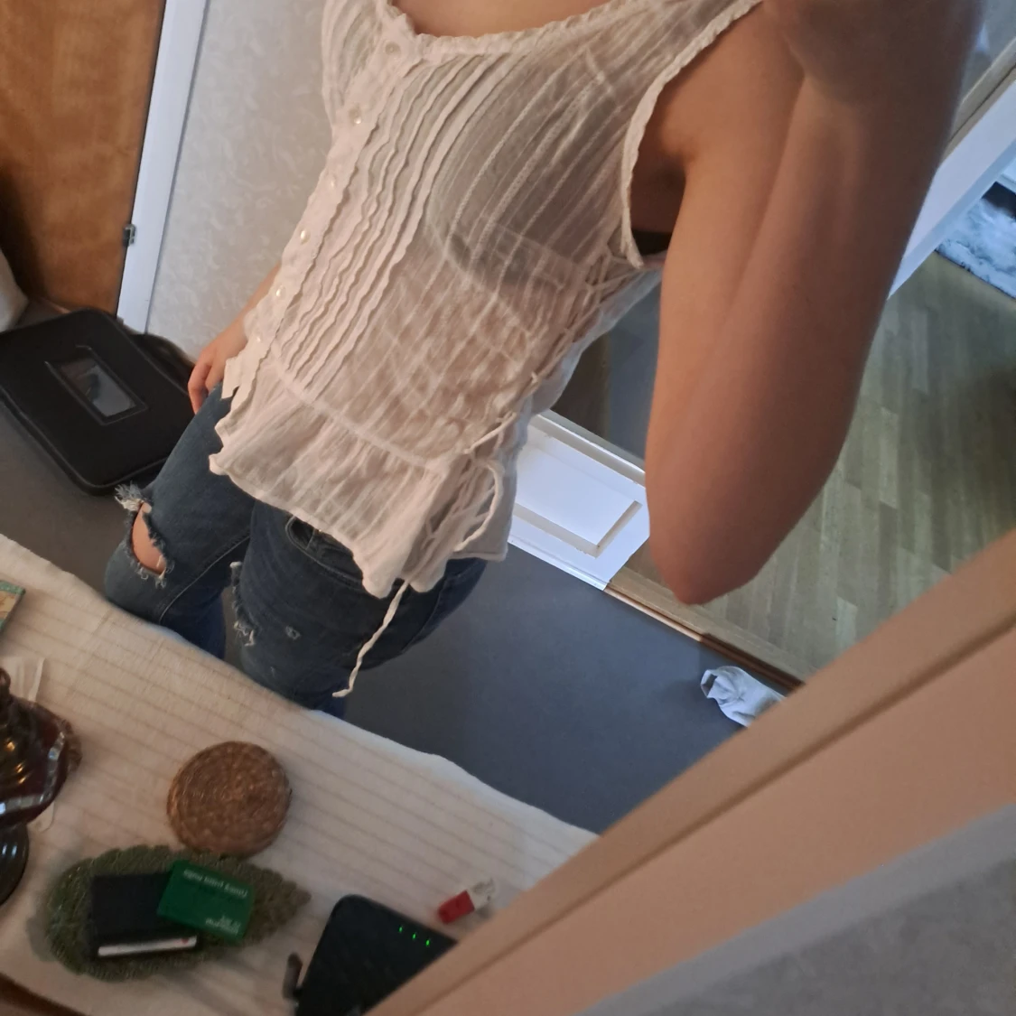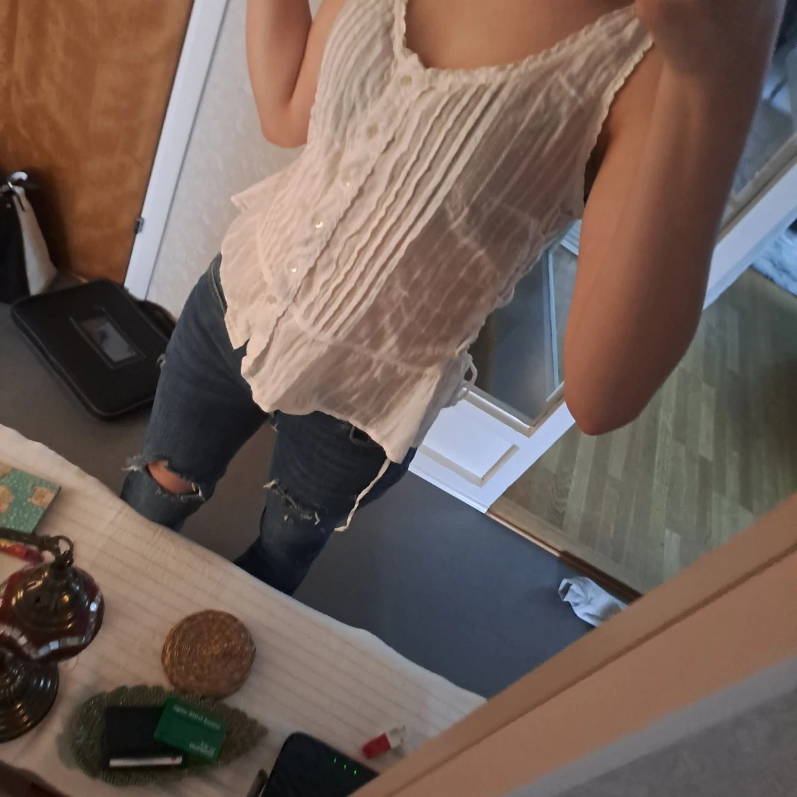 Säljer en söt vit ärmlös blus med knappar framtill. Blusen har en lätt och luftig design med volangdetaljer som ger en romantisk känsla. Perfekt för varma sommardagar eller som ett lager under en kavaj.