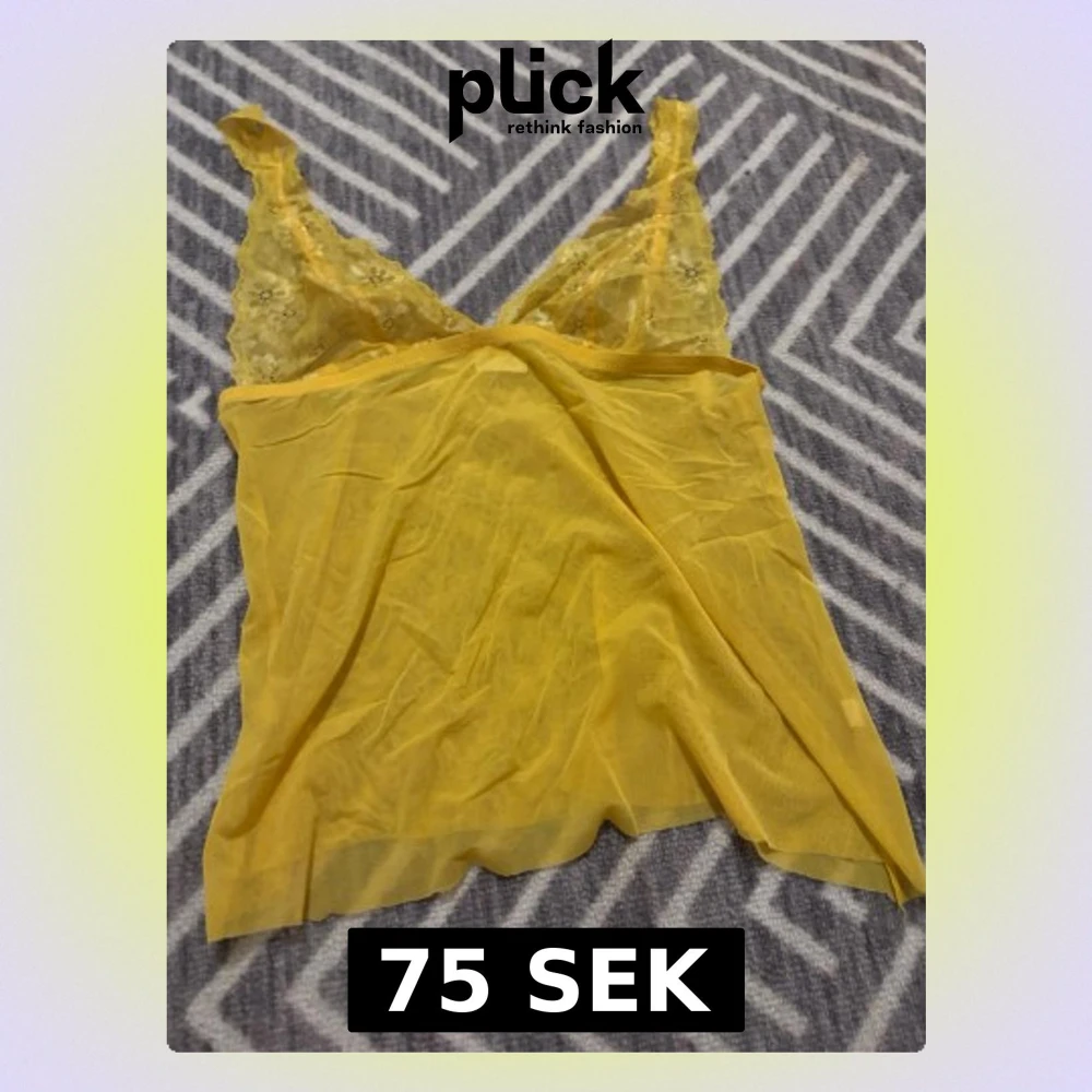 Säljer en tunn och transparent gul linnetopp med spetsdetaljer och blommönster vid axelbanden. Toppen har v-ringad hals och ärmlös design med smala axelband. Märket och storleken står inte men skulle säga att det är en xs/s