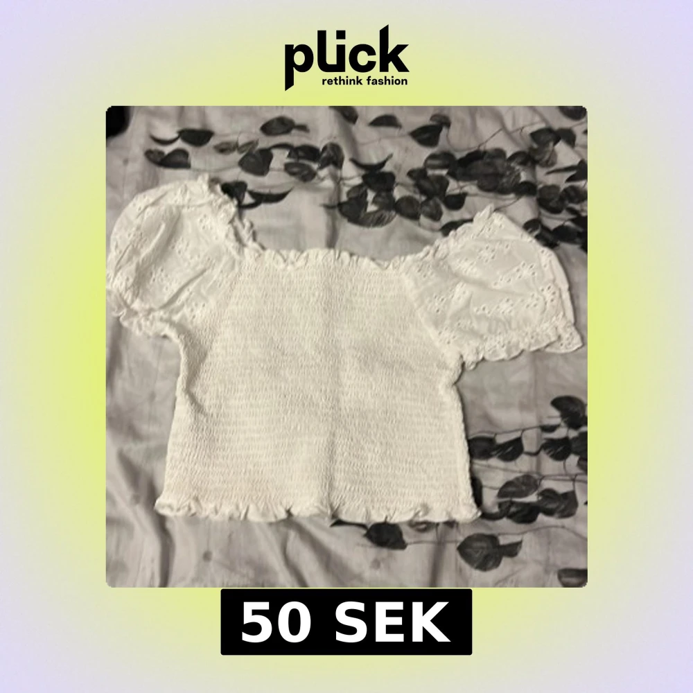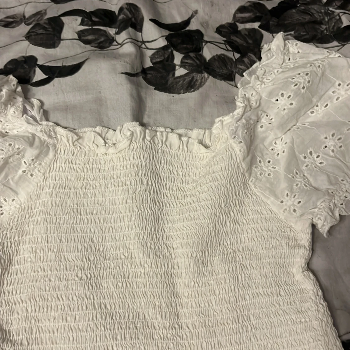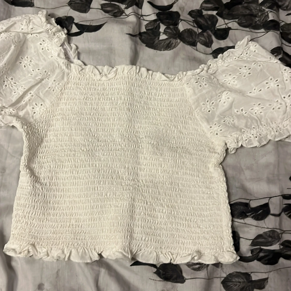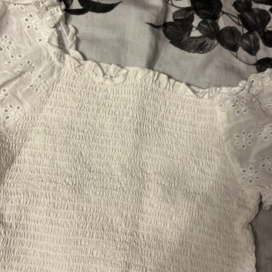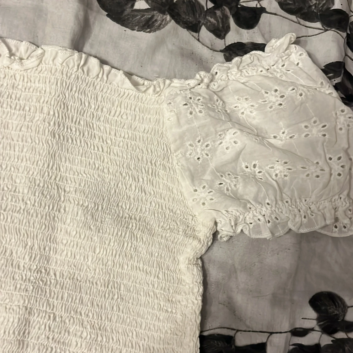 Supersöt vit blus med smockad kropp och puffiga korta ärmar i broderad bomull. Ärmarna har volangkant och blommiga hålbroderier som ger en romantisk vibe. Toppen är croppad och har volangdetaljer längs halsringning och nederkant.