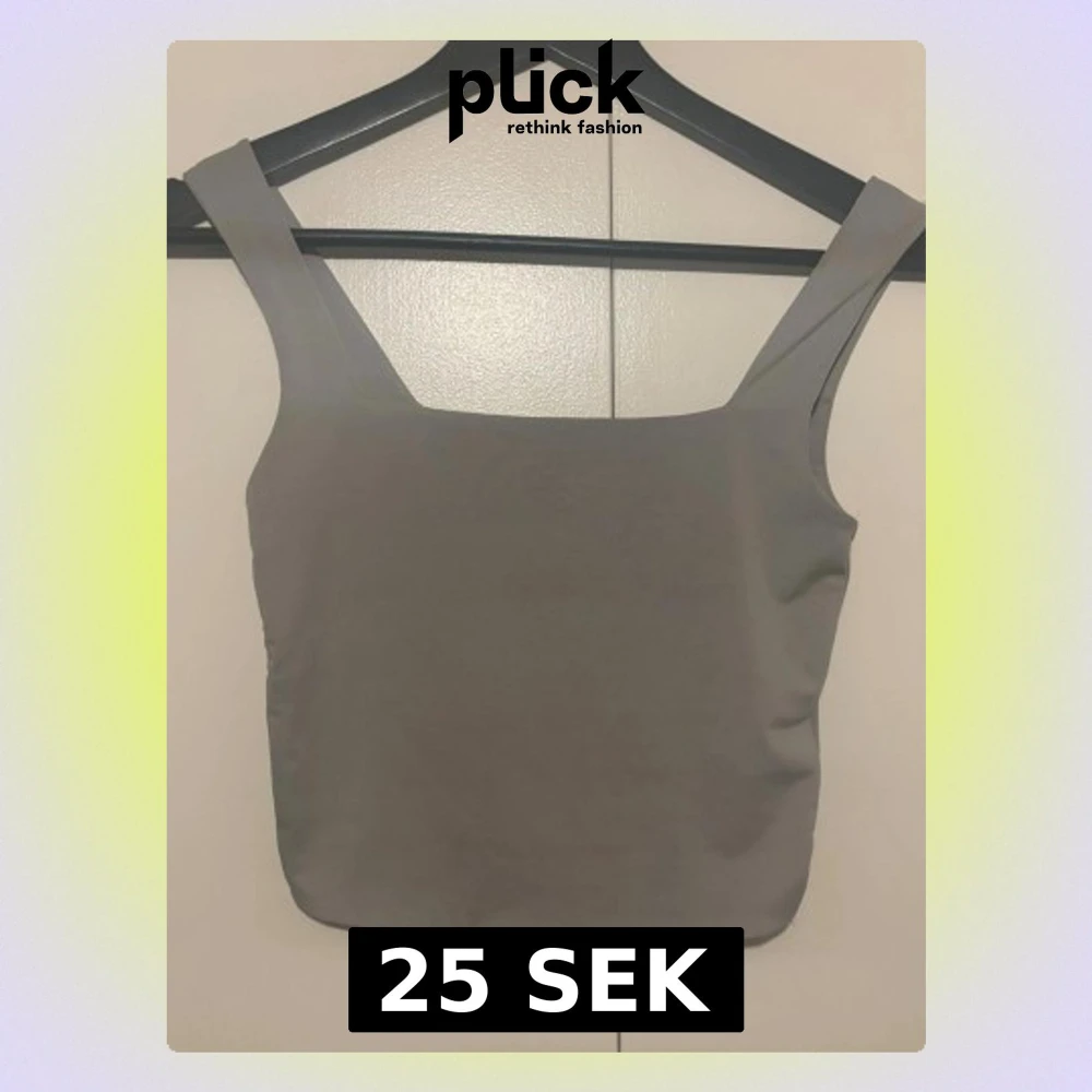 Säljer en enkel och stilren grå croppad linnetopp med breda axelband och rak halsringning.