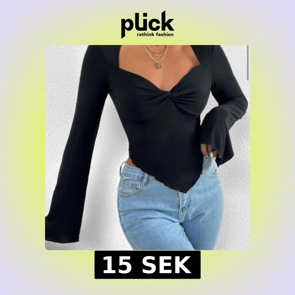 Svart långärmad topp från Shein med croppad passform. Toppen har twistad detalj framtill och asymmetrisk nederkant. Använd få gånger och i bra skick.
