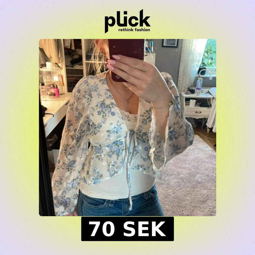 Supersöt blommig blus i vitt med blåa och gråa blommor. Blusen har långa, vida ärmar, v-ringning och knyt framtill. Tunt, luftigt material som ger en romantisk vibe och volang nertill. Perfekt att styla med jeans för en fräsch look.