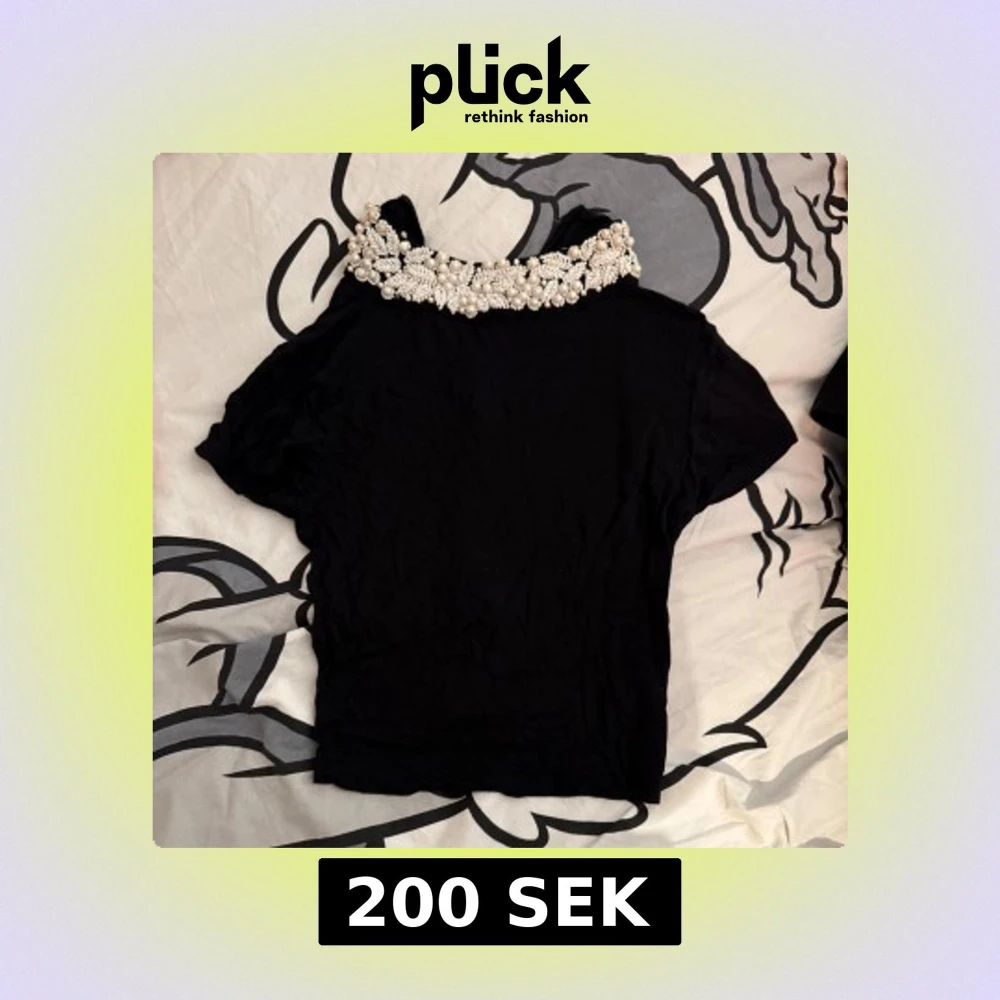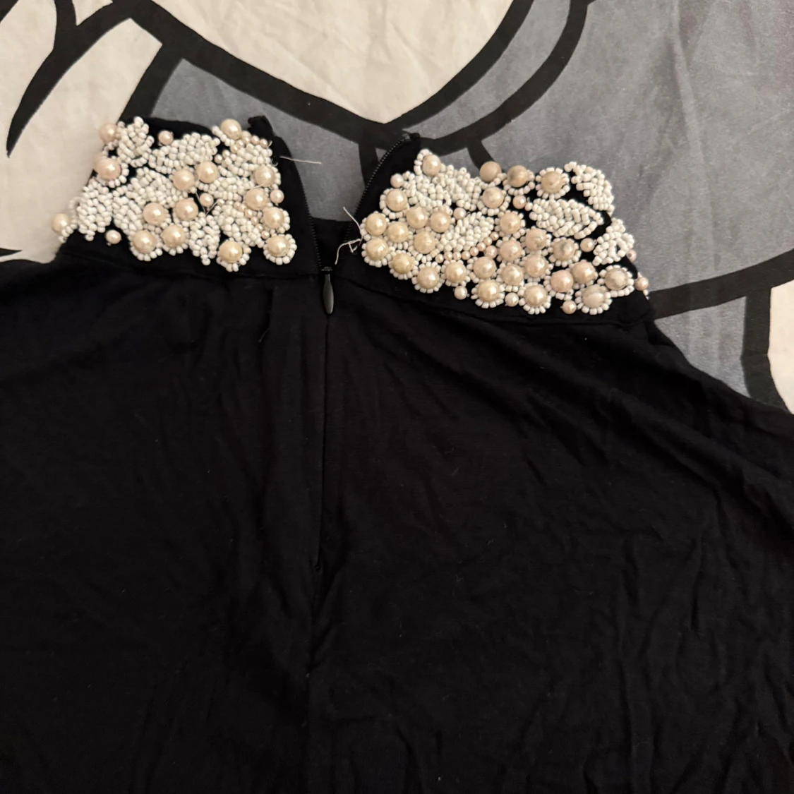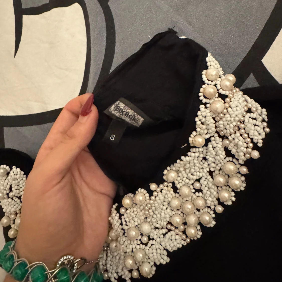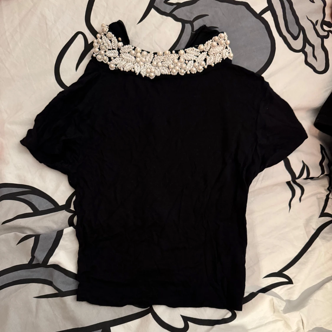 Snygg svart topp med korta ärmar och en fantastisk pärlbroderad krage. Toppen har en normal passform och är tillverkad i ett mjukt material.