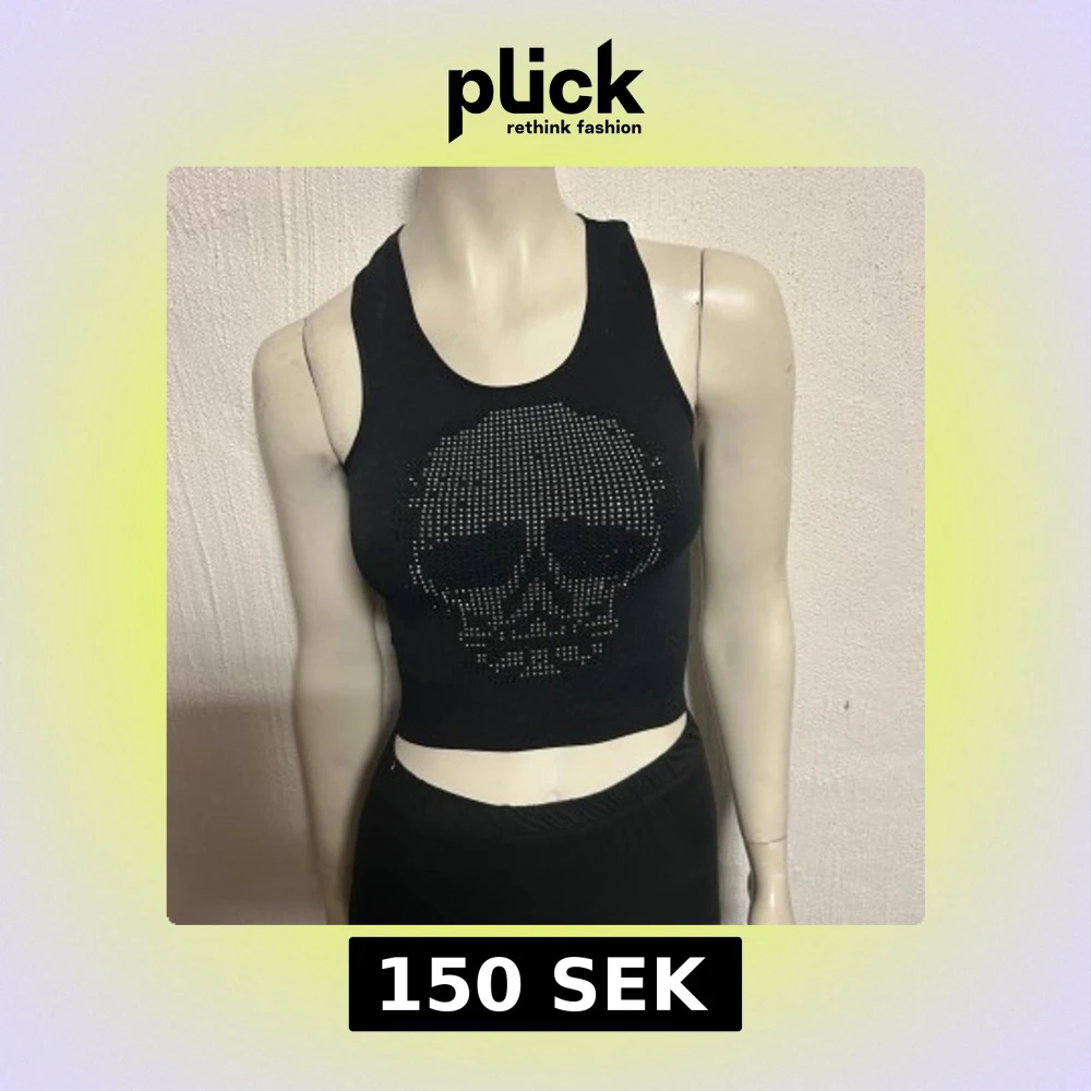 Snygg svart croppad linnetopp med ett coolt dödskallemotiv i glittrande stenar på framsidan. Perfekt för en edgy look.
