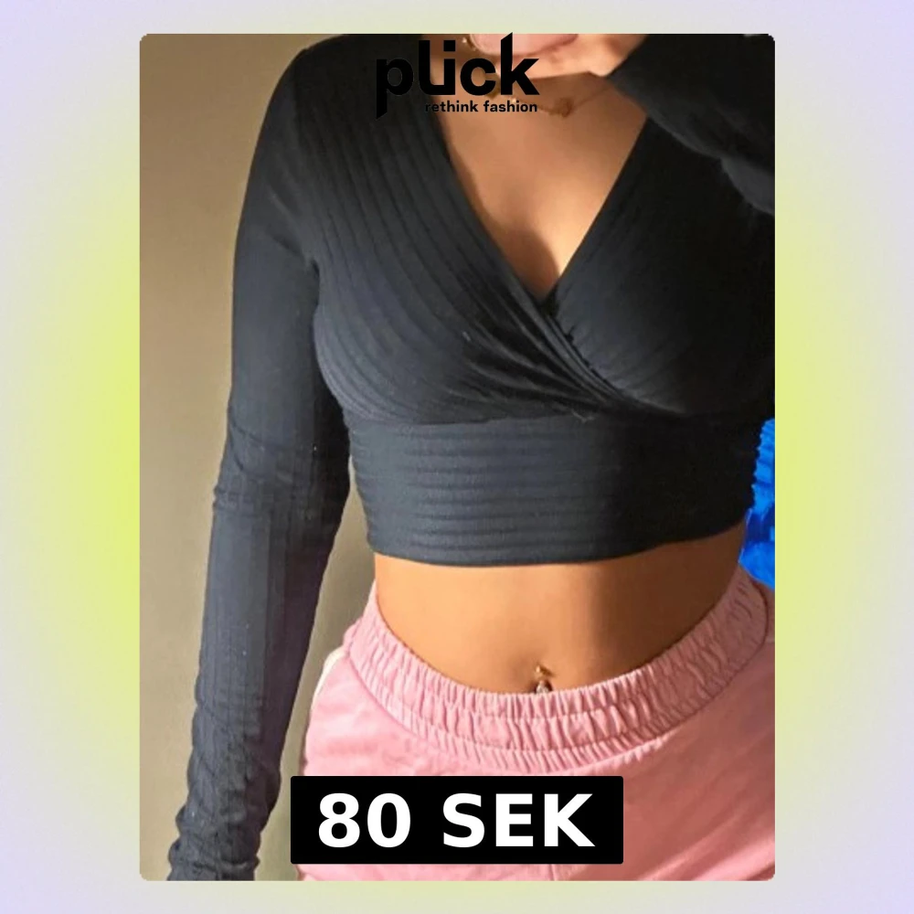 Säljer en svart croppad topp med omlott-design och ribbad struktur. Toppen har långärmade och djup v-ringning, perfekt för att skapa en snygg och modern look. Materialet känns mjukt och stretchigt, vilket gör den bekväm att bära.