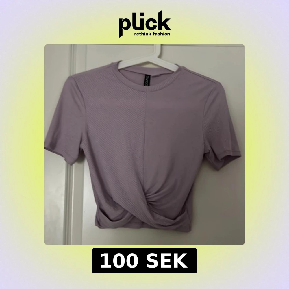 Säljer en ljuslila ribbad croppad topp med korta ärmar och twistad detalj framtill. Perfekt för vår och sommar, enkel att matcha med både jeans och kjol. Storlek S