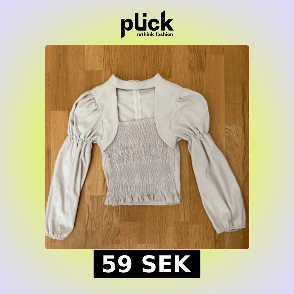 Supersöt ljusbeige blus med puffiga långärmar och smockad framsida. Toppen har en unik bolero-liknande överdel och hög halsringning. Materialet känns mjukt och har en lätt glans. Perfekt för dig som gillar trendiga detaljer och volym i ärmarna.